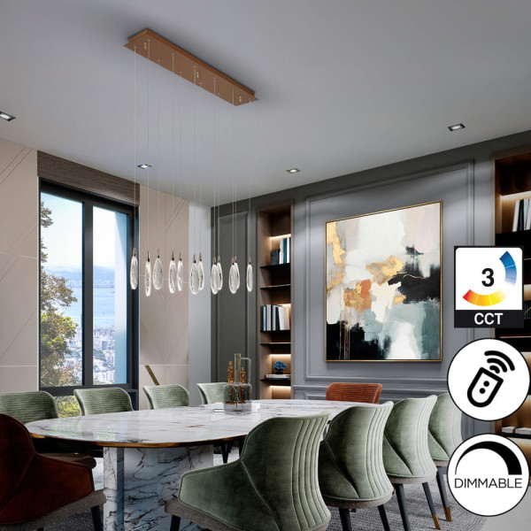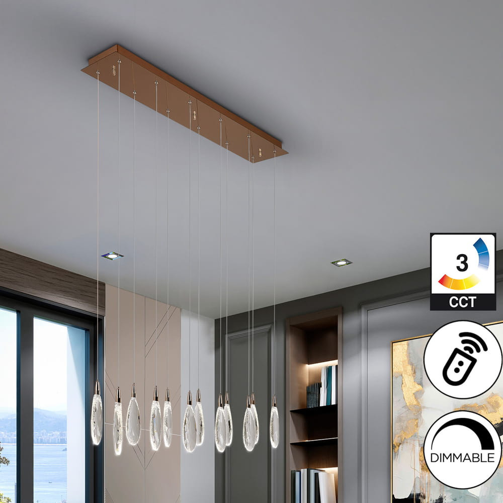 Colgante de techo lineal oro rosa de 12 luces con lágrimas de cristal. 24W, CCT 2700-6000K, 2400lm, dimable, mando incluido
