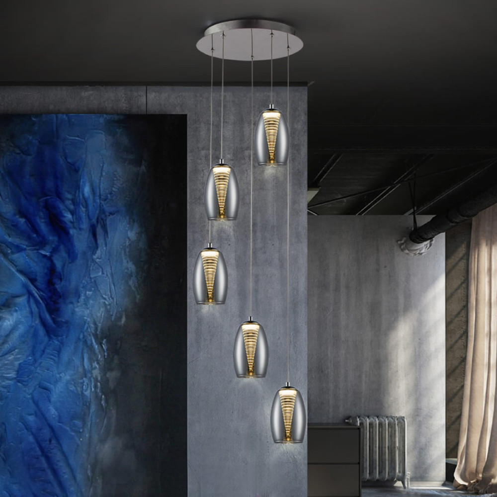 NEBULA Lámpara de 5 luces LED, realizada en metal acabado cromo. Doble tulipa, exterior realizada en cristal espejado e interior en policarbonato transparente con forma de cono escalonado. Regulable en altura.