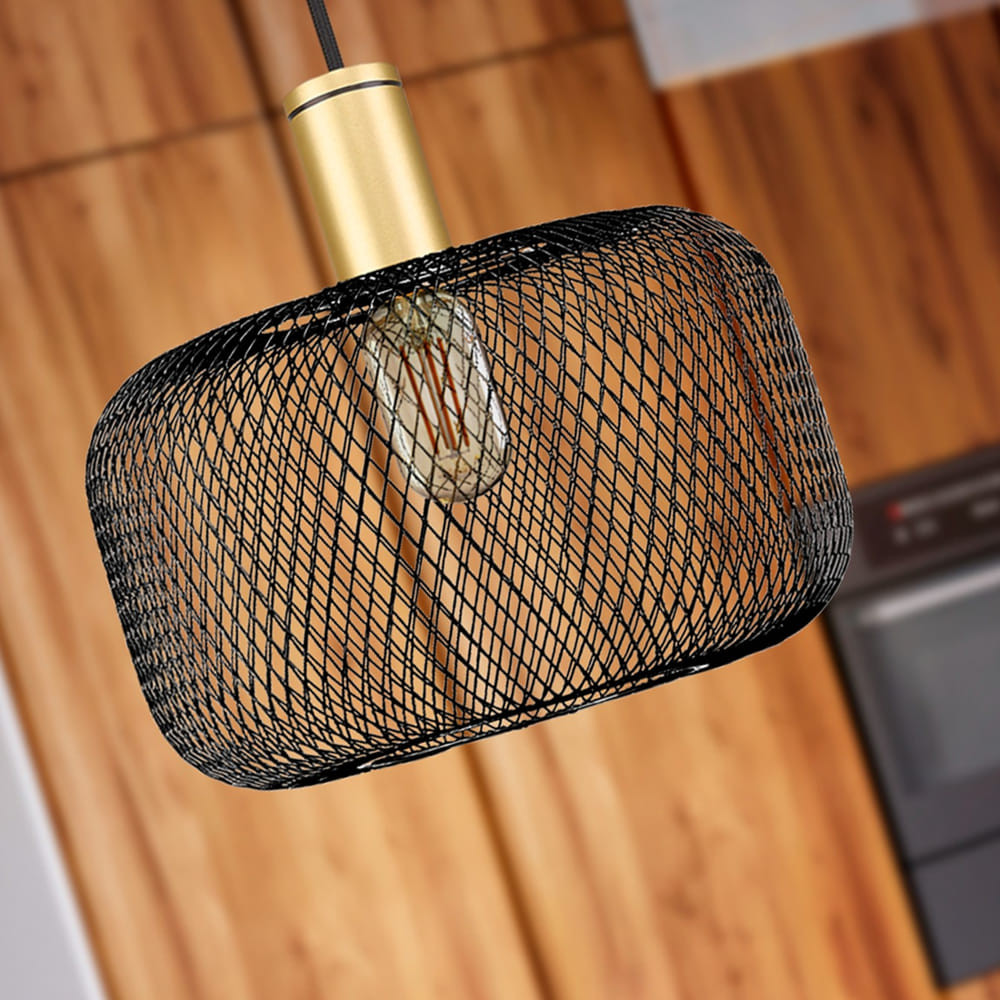 Colgante de techo negro con tulipa de malla metálica y detalles dorados.