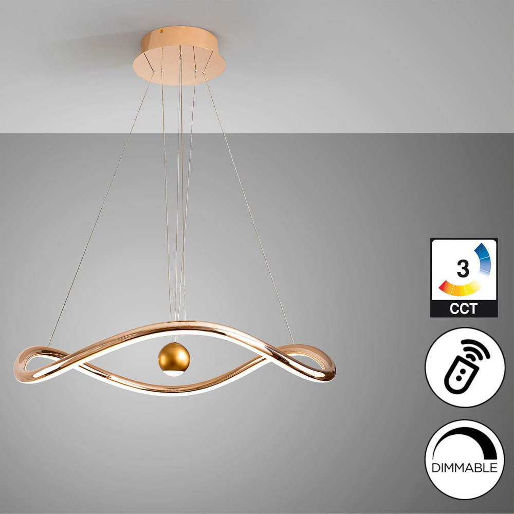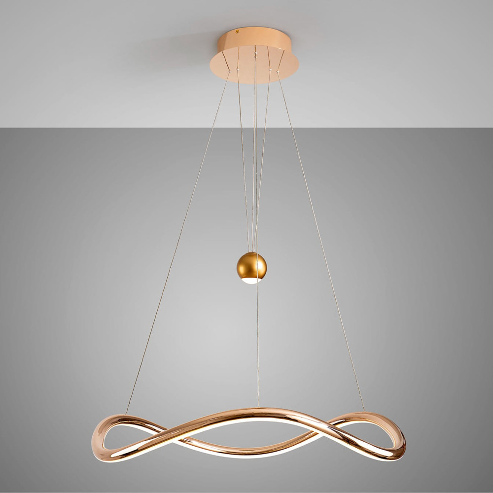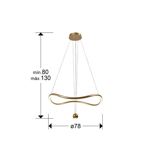 Lámpara realizada en aluminio y acero acabado en dorado brillo. Difusor de silicona opal. Permite regular la altura manualmente tirando de la bola central. Iluminación LED 50W, CCT: 2700-5000 K. 3,100 lm. DIMABLE. Incluye mando a distancia.