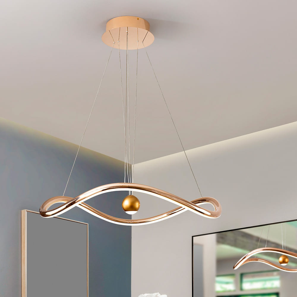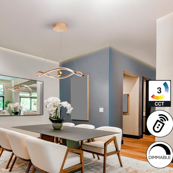 Colgante acabado en dorado brillo, se puede regular la altura tirando de la bola. 50W, 2700-5000K, 3100 lm, mando y TUYA