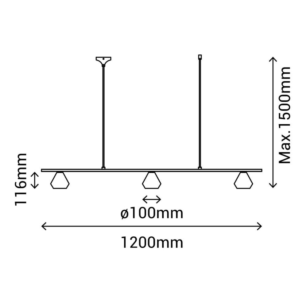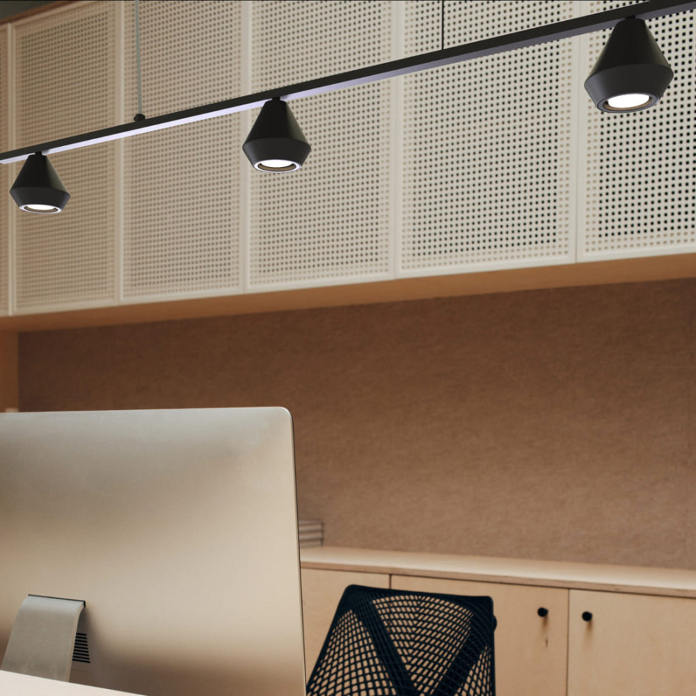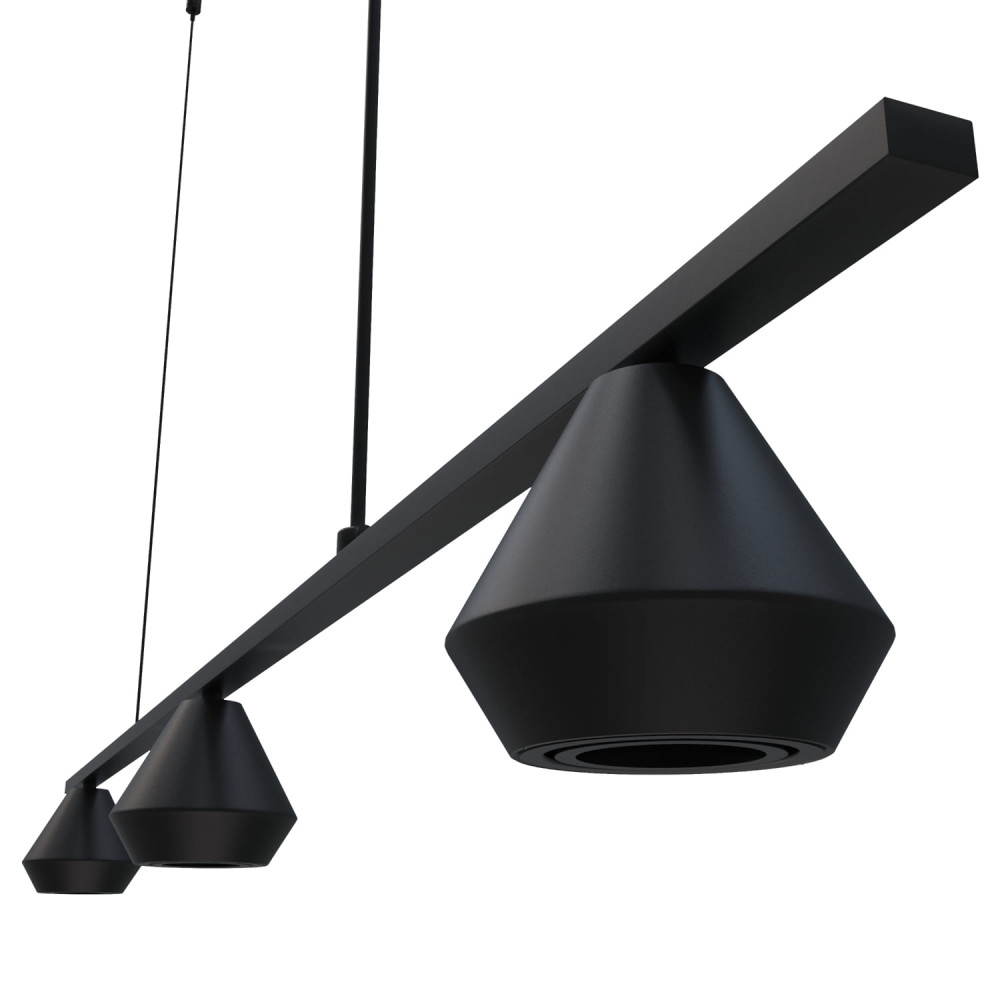 Lámpara de techo lineal con 3 puntos de luz focal en acabado negro arenado. La versión de LUA más ambiciosa y completa. Esta finísima pieza cuenta con 3 puntos de luz focal dispuestos a lo largo de una barra de metal. Creará un ambiente acogedor y único, ya sea en nuestro negocio o en nuestra cocina o salón. Cuenta con un único florón, lo que le otorga ligereza y elegancia minimalista. Tiene un cable de nailon negro para un acabado impecable y funciona con 3 bombillas GU10.