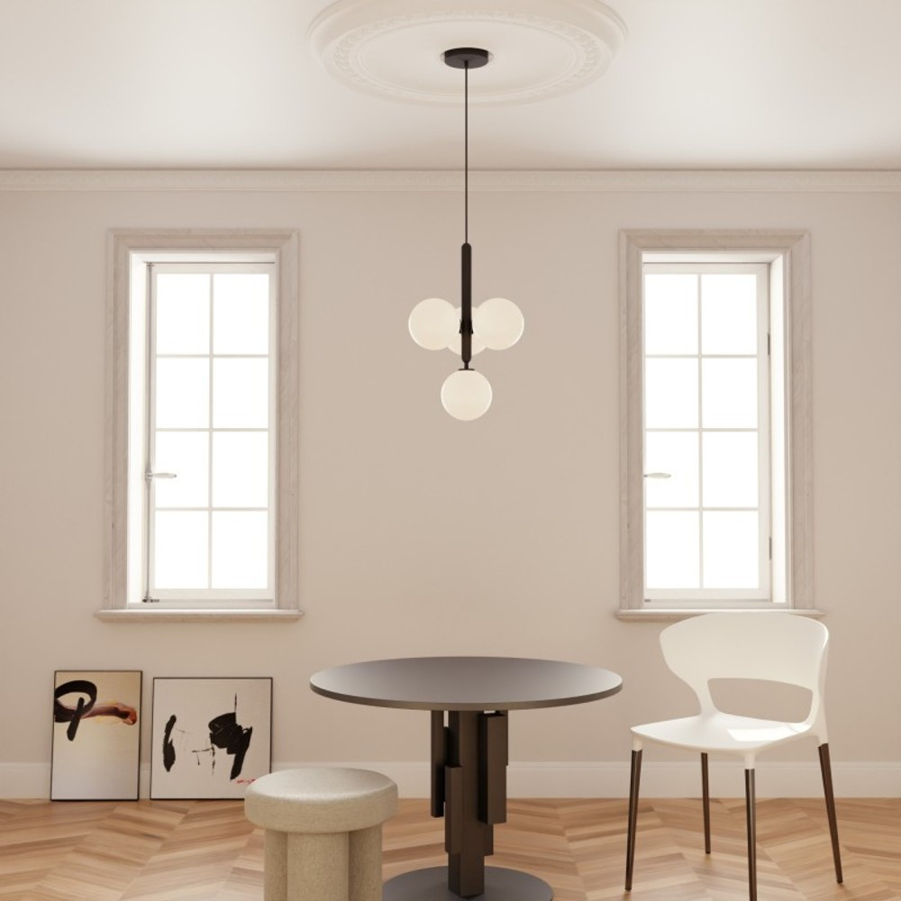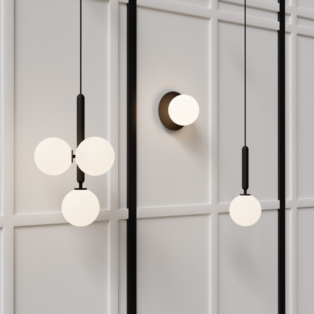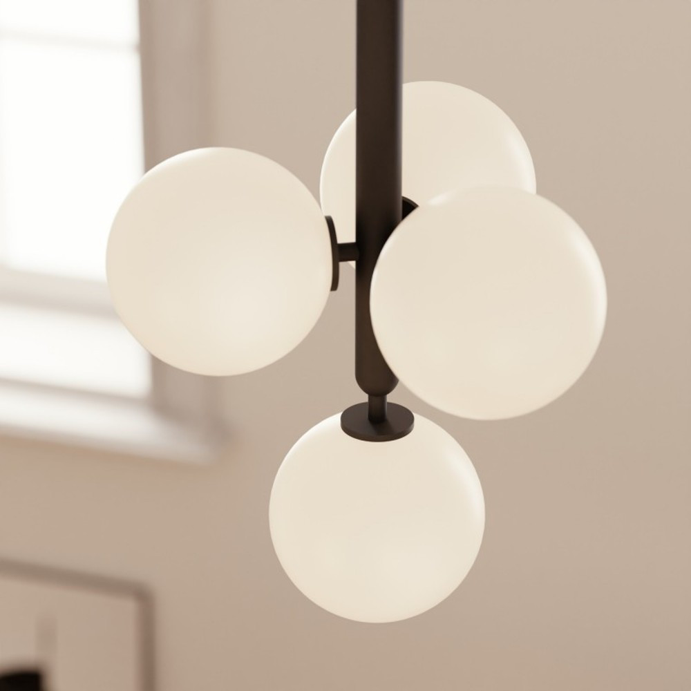 Lámpara de techo de cuatro bolas de vidrio blanco opal y acabado negro arenado. Esta impresionante pieza de iluminación será el centro de atención de cualquier estancia y no dejará indiferente a nadie . La combinación del vidrio blanco y el tono negro mate resulta de una elegancia exquisita. Confeccionada con materiales de alta calidad y con cable negro en tela de nailon .Funciona con bombillas G9.