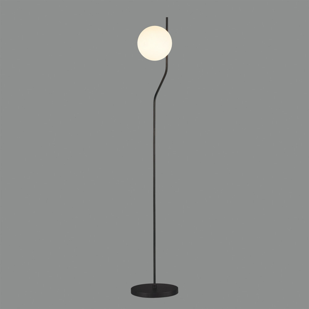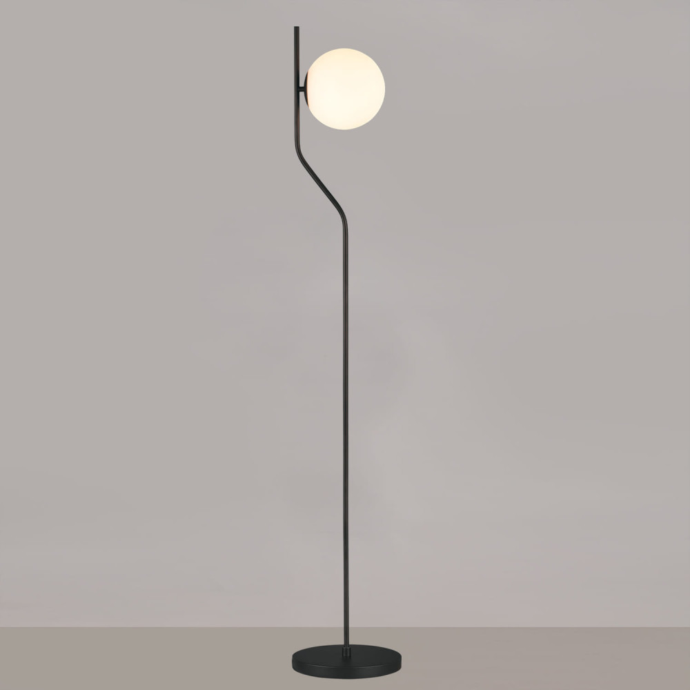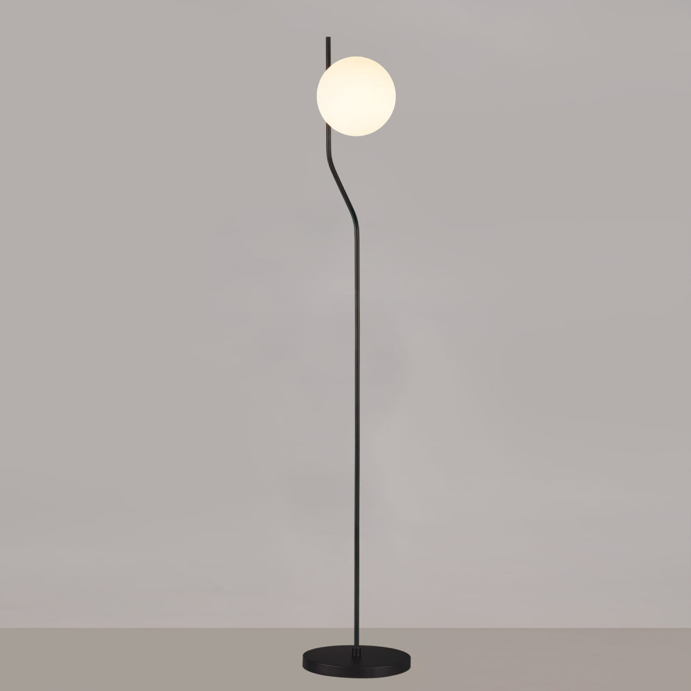 Lámpara de pie con estructura metálica negro mate y tulipa de cristal opal.