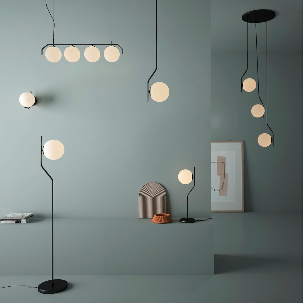 MAUI es una lámpara de pie para iluminación interior. Fabricado en metal y cristal con acabado en negro y opal.