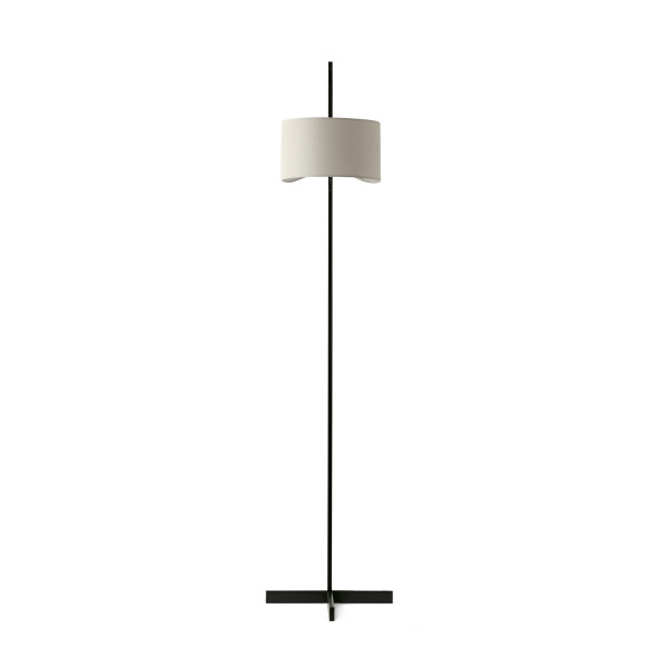 STAND UP by Estudi Ribaudí se caracteriza por su pantalla de lino perfectamente integrada en la estructura negra. Este minimalista pie de salón se regula en altura. Su base en forma de T le da estabilidad y personalidad.
