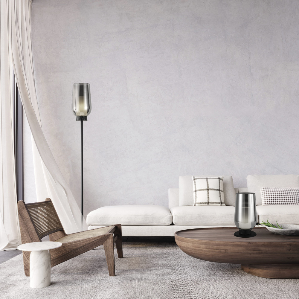 Nora es una lámpara de pie fabricada en cristal y metal en acabado cromo, negro y mármol. Admite bombilla E27.