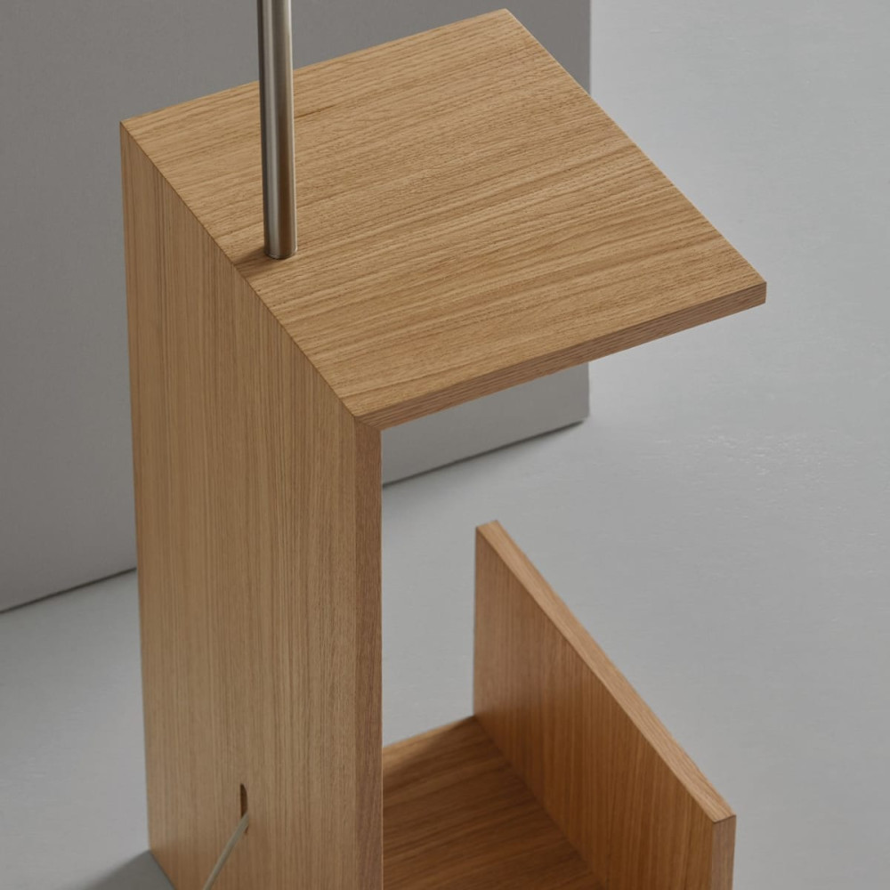Fusta aporta una versión racional, moderna y elegante a este tipo de luminarias que integran mueble auxiliar y la lámpara. Base realizada en distintos acabados de madera donde se inserta el pie metálico que soporta la pantalla cúbica de esquinas redondeadas en algodón soft blanco. Situada en un rincón de lectura, junto a una butaca o a orillas del sofá es sorprendentemente funcional.