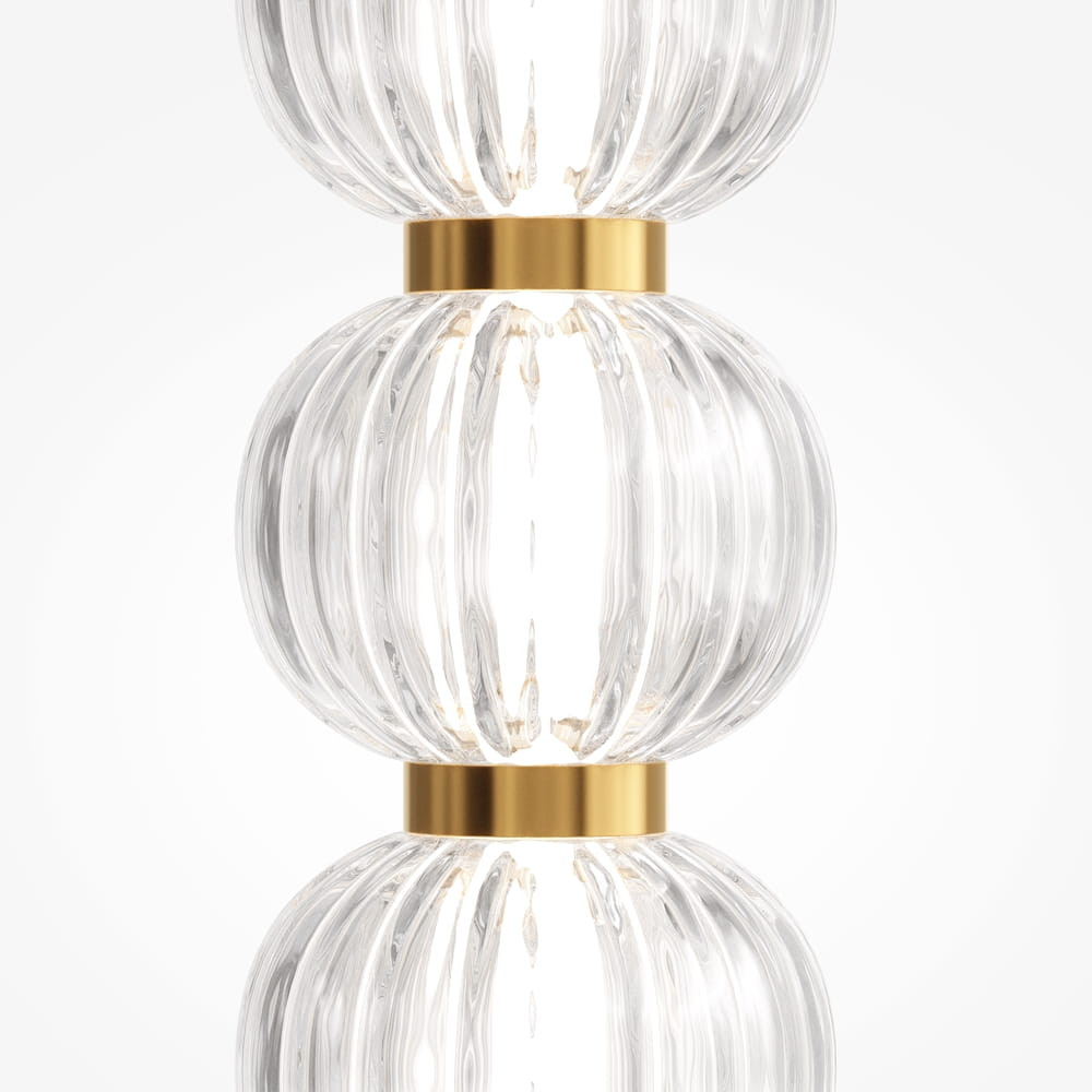 La serie presenta composiciones cautivadoras formadas por numerosas “cuentas” elaboradas en vidrio fundido de alta calidad, cada una decorada con un patrón texturizado y repetitivo que genera un dinámico juego de luz y reflejos. La fuente de luz LED recorre estas cuentas como un hilo, realzando su encanto luminoso.
