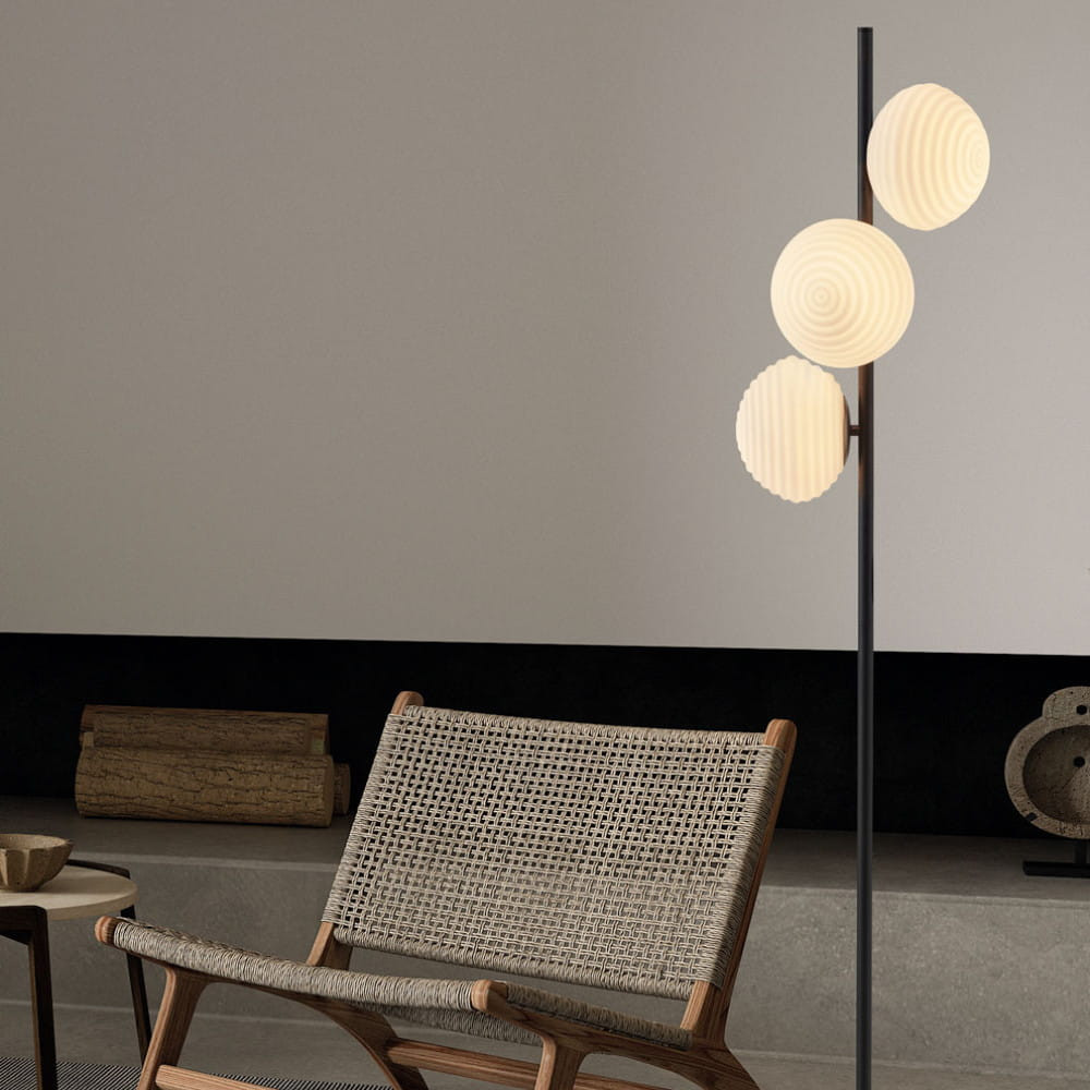 Lámpara de pie que combina estilo y funcionalidad en un diseño cautivador. Con tres pantallas esféricas de cristal opal acanalado, CIAO emite una luz suave y difusa, creando un ambiente cálido y acogedor en cualquier espacio.