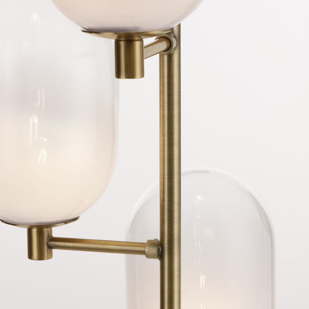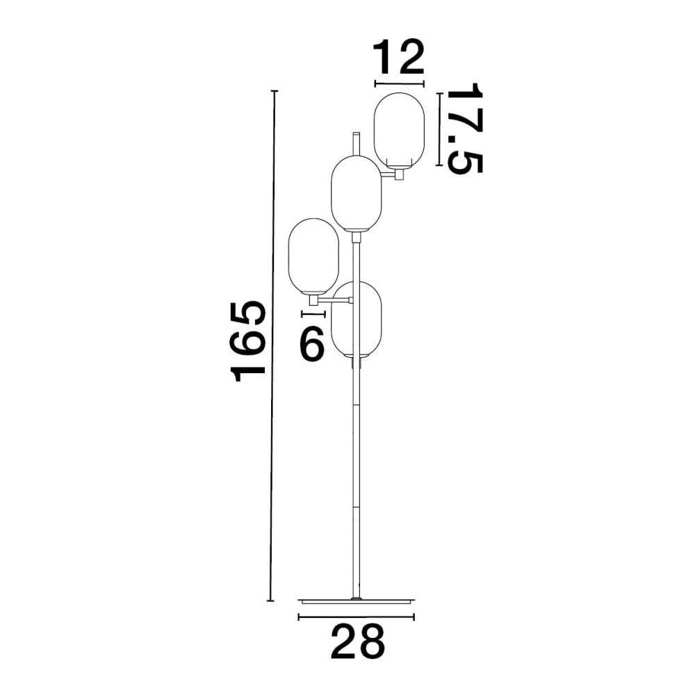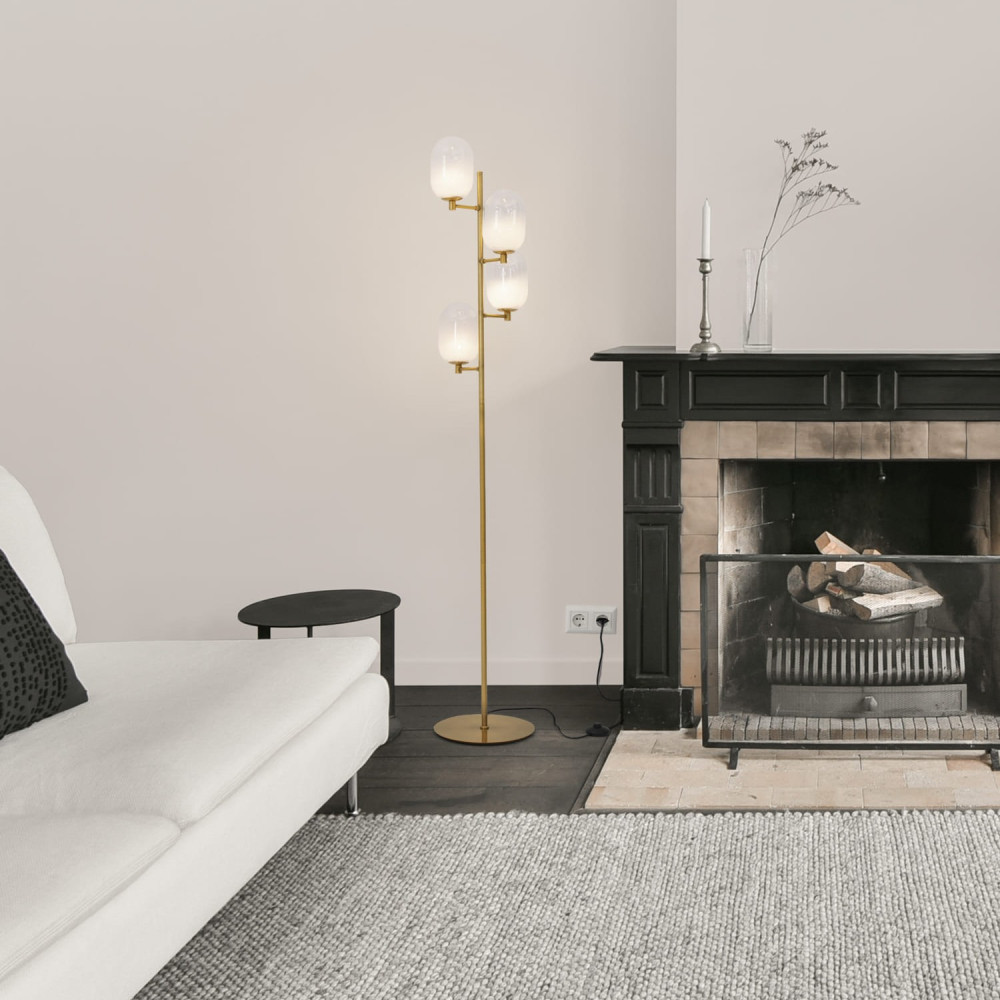 Lámpara de pie de la colección BALOR que cuenta con un diseño moderno y elegante, con un acabado dorado y tres tulipas de cristal en forma de globo. Funciona con cuatro bombillas G9 no incluidas y es perfecta para iluminar cualquier sala de estar o rincón acogedor con un estilo sofisticado.