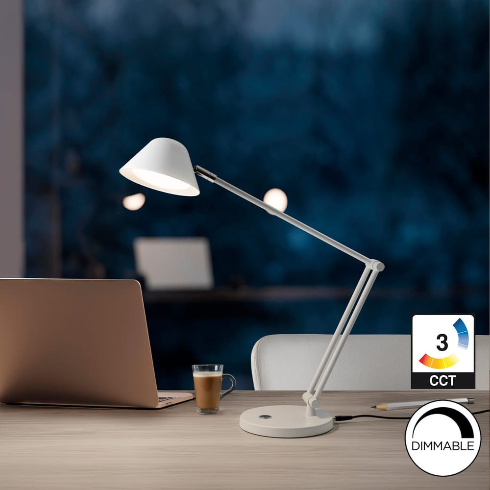 Flexo de escritorio LED negro con brazo articulado y pulsador táctil. 10W, 900lm, CCT 3000K-6500K.