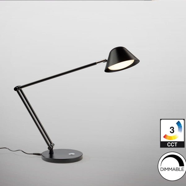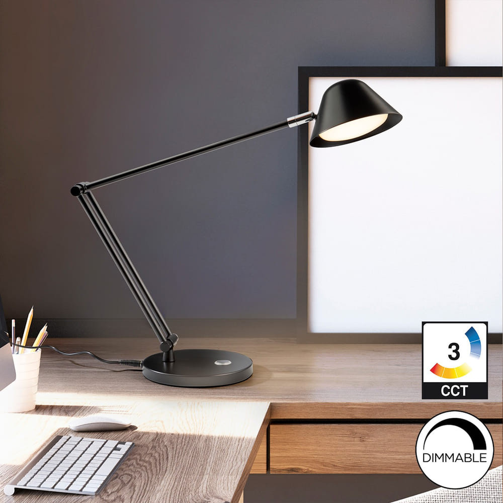 Flexo de escritorio LED blanco con brazo articulado y pulsador táctil. 10W, 900lm, CCT 3000K-6500K.