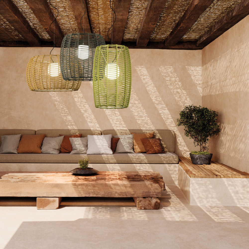 Readaptada para exterior, la colección POMA filtra la luz de forma original a través de las cuerdas trenzadas en zigzag. Colgantes, plafones y nuevas lámparas de pie con IP66 componen esta familia.