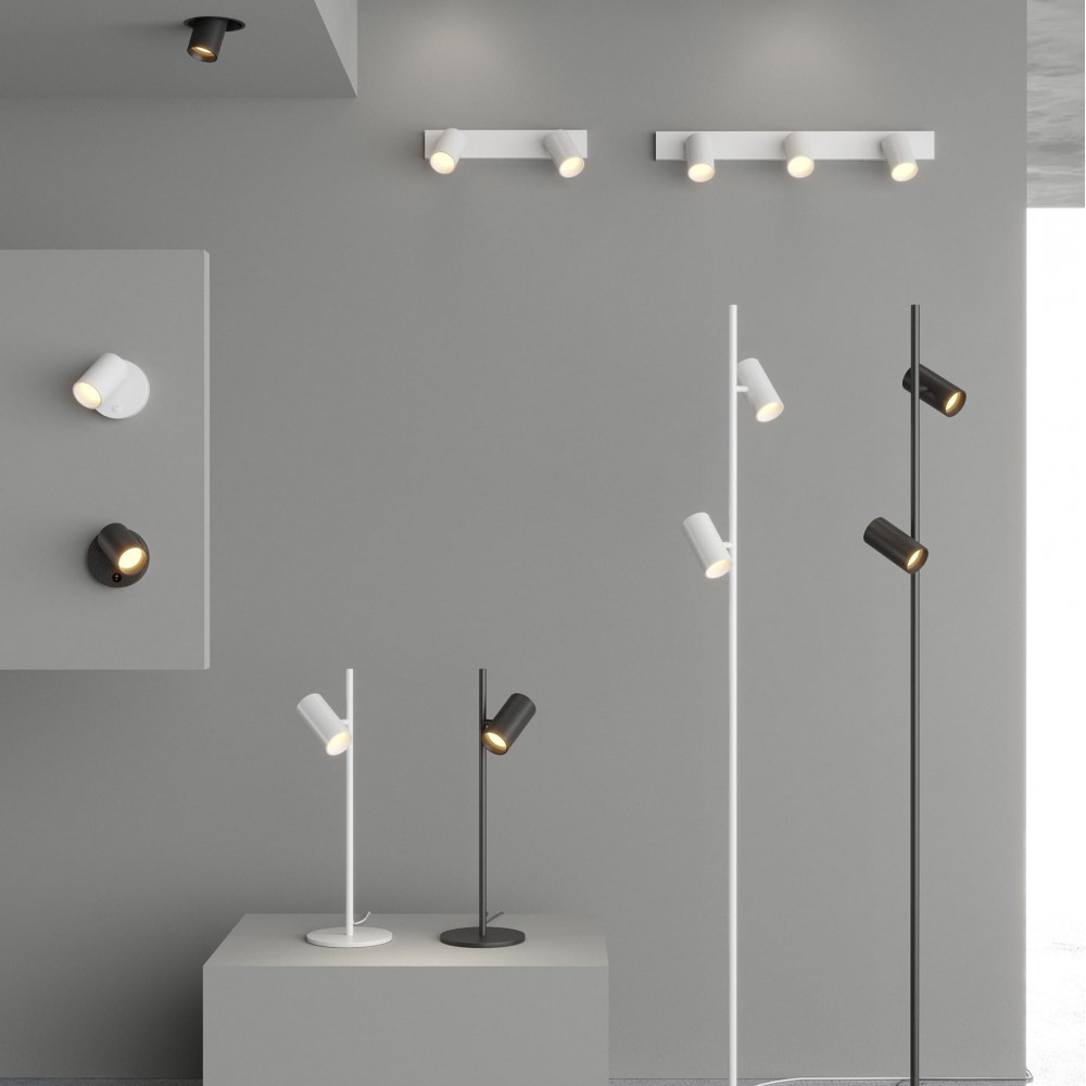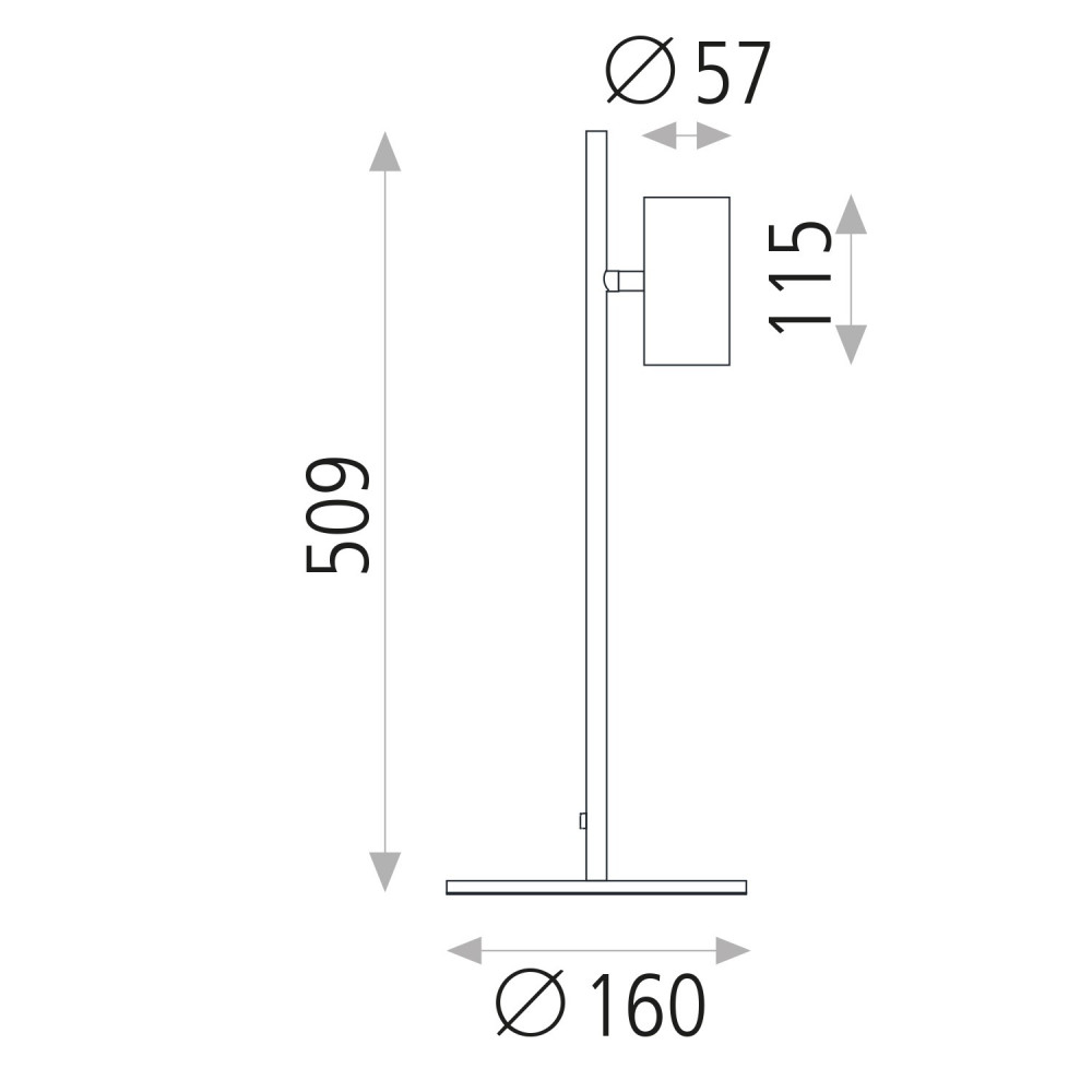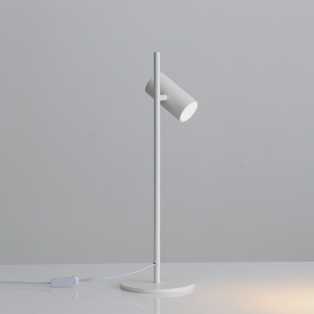 Lámpara de sobremesa Gina. Iluminación de diseño simple y elegante, práctico gracias a su cabezal orientable para dirigir la luz al lugar deseado. Fabricada con cuerpo y base redonda de aluminio en color blanco texturizado o negro. Incluye un interruptor en el cable.