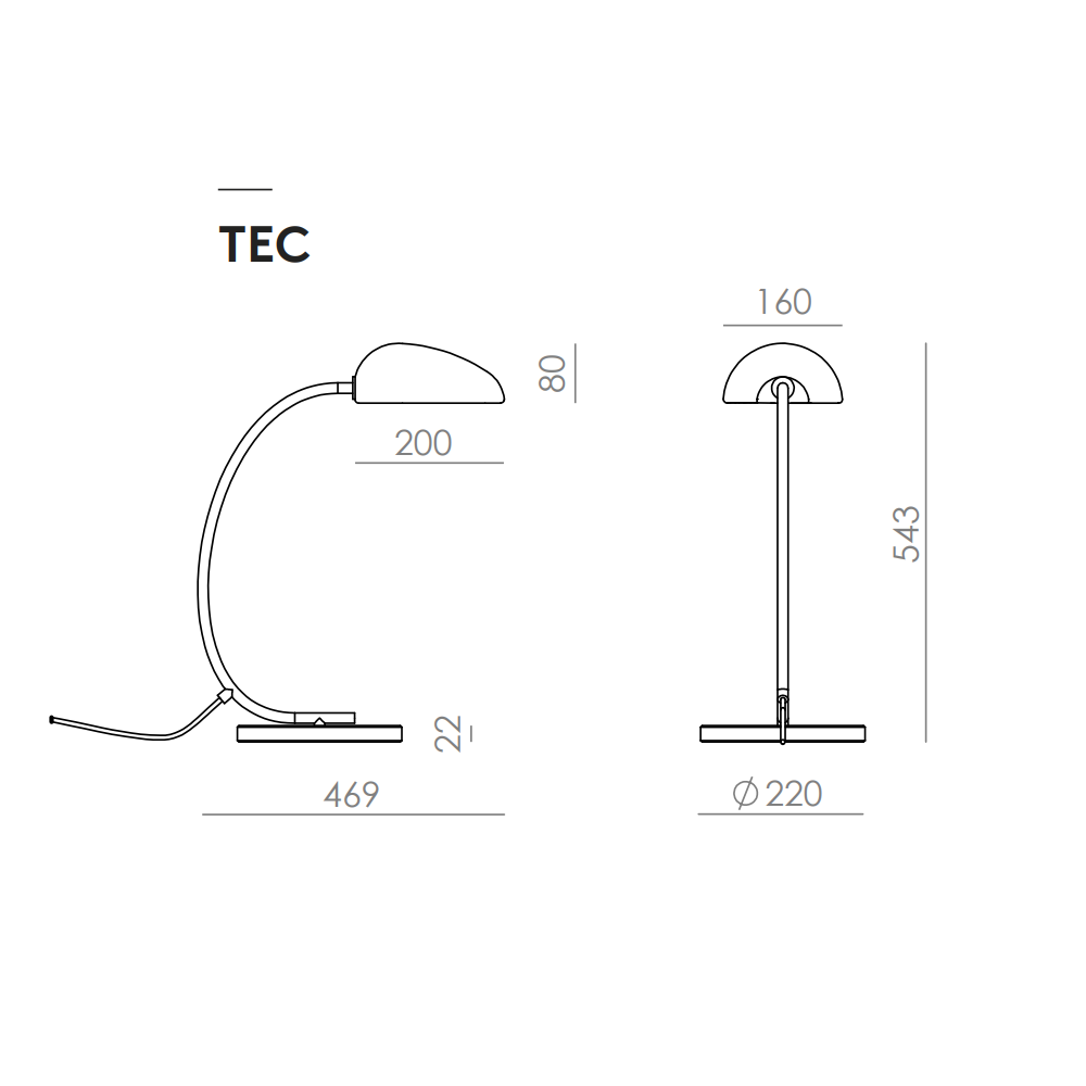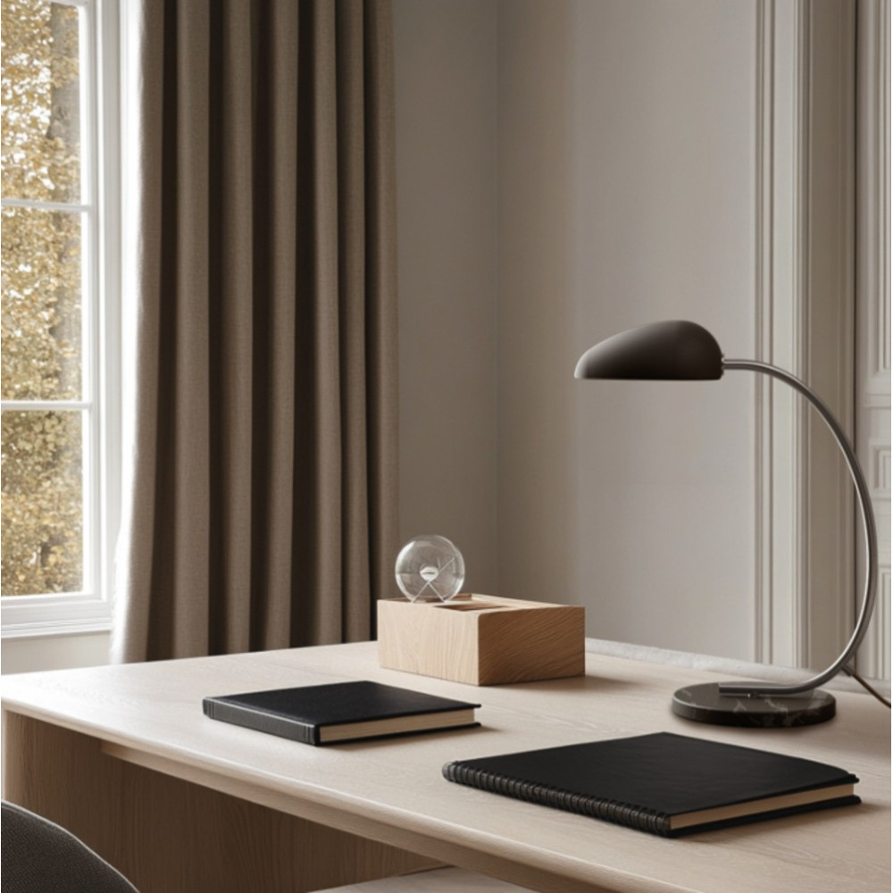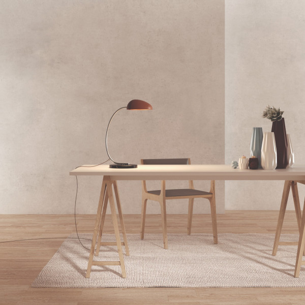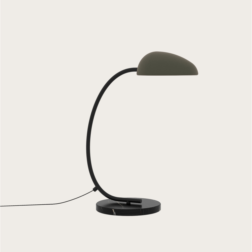Lámpara sobremesa regulable con base de mármol, cuerpo en aluminio y pantalla de metal.