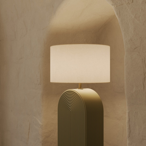 Su base de cerámica presenta una forma arquitectónica rematada por un arco, recorrida por un relieve continuo que genera un atractivo juego de líneas y profundidad. Este cuerpo cerámico puede personalizarse en una selección de colores, permitiendo adaptar la pieza a diferentes estilos decorativos y crear combinaciones únicas.