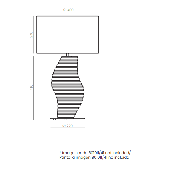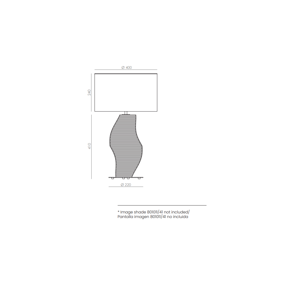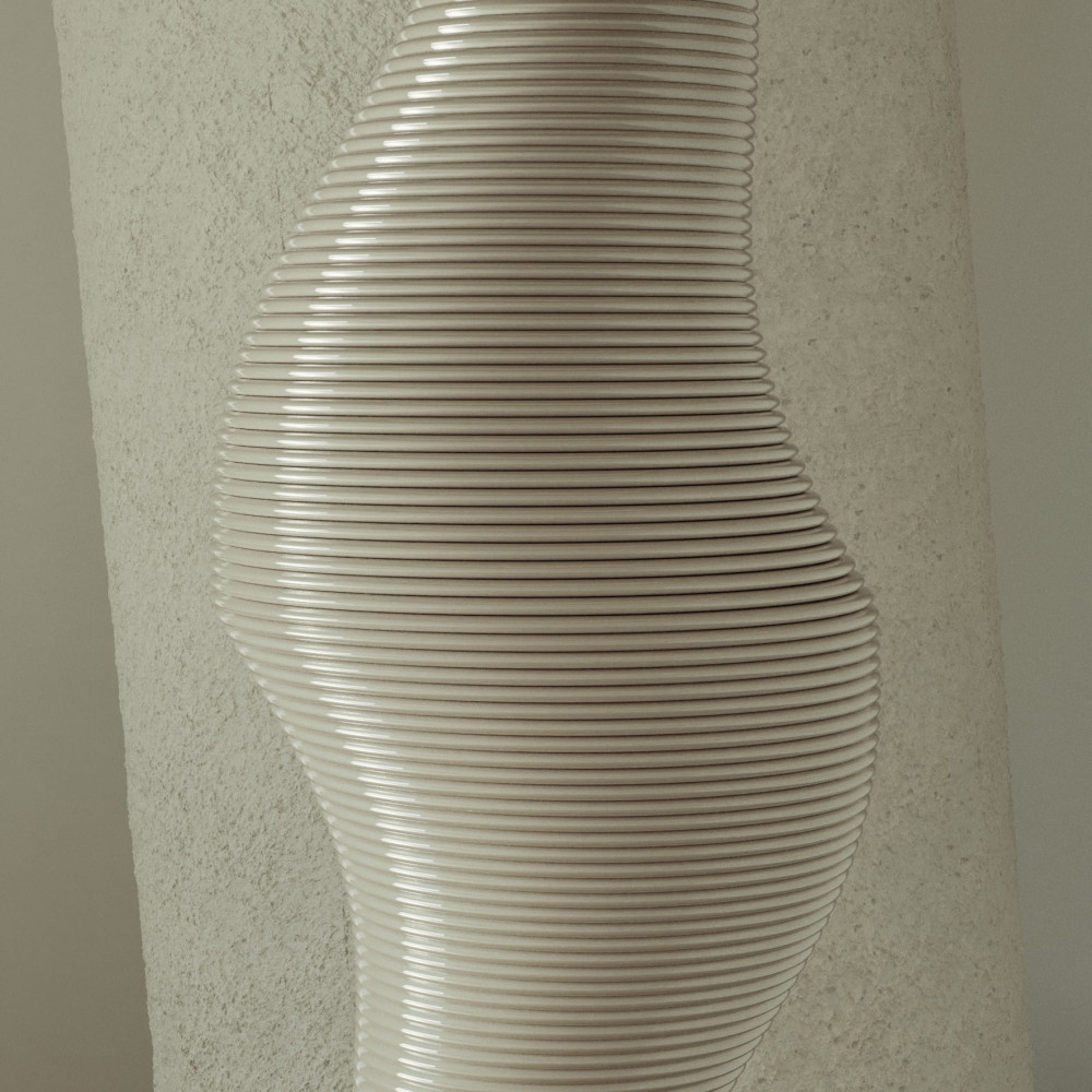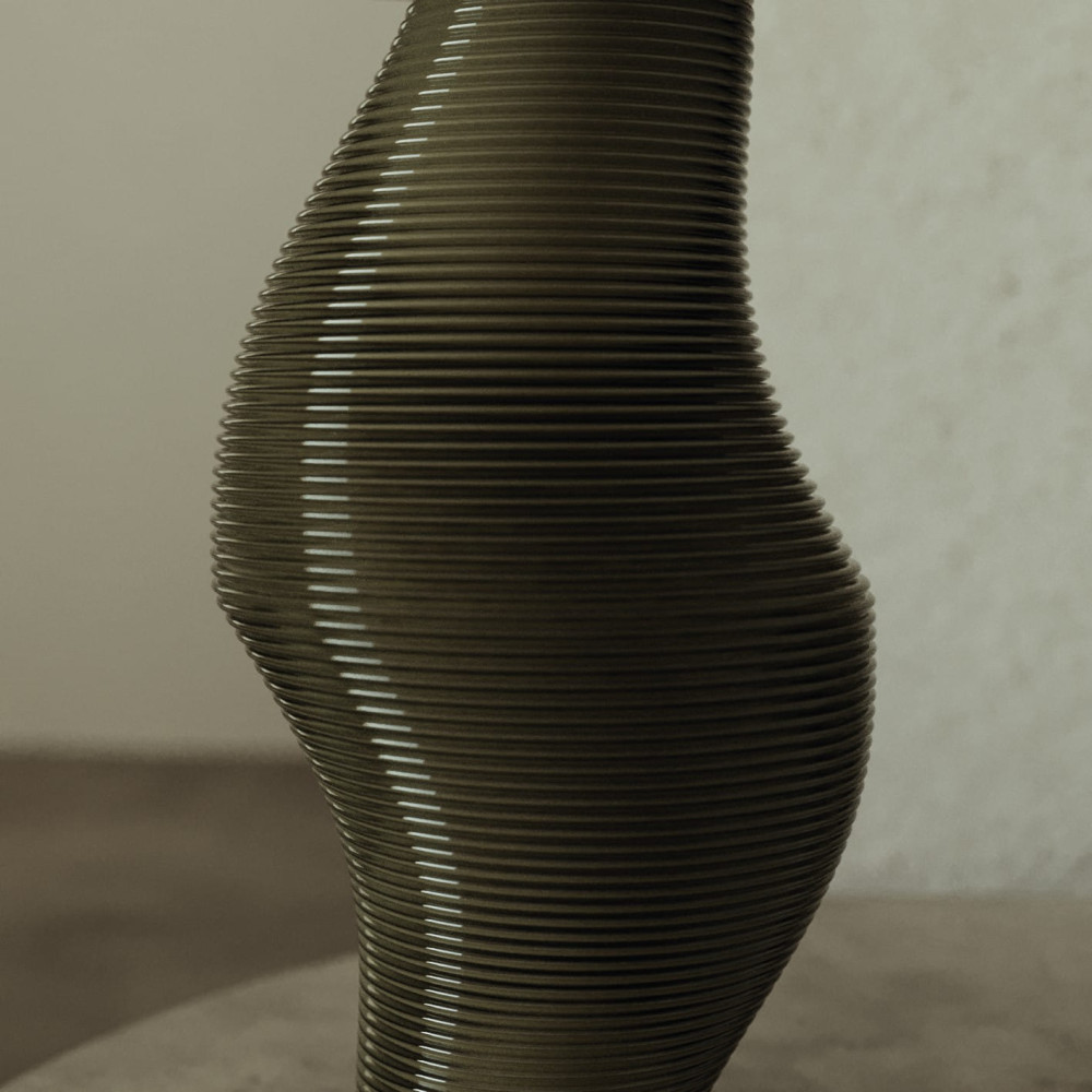 Su base está realizada en vidrio estriado pintado a mano, cuya forma curvada y vertical genera un sutil juego de reflejos y textura que aporta profundidad y sofisticación al conjunto. El cuerpo de vidrio puede personalizarse en una amplia selección de colores, permitiendo adaptar la lámpara a diferentes ambientes y estilos de interiorismo.