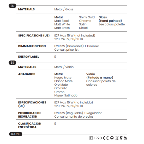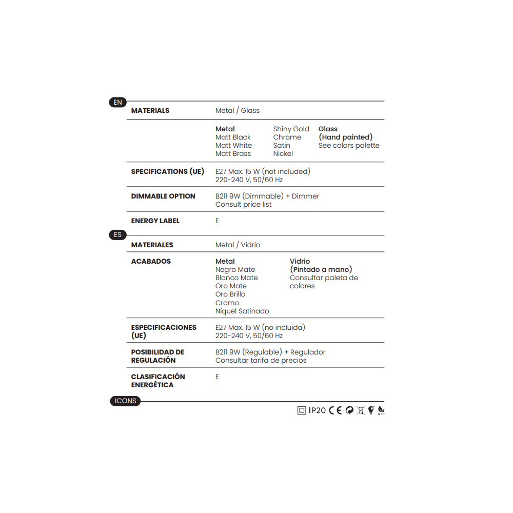 La estructura metálica, disponible en distintos acabados, crea un contraste elegante con el vidrio y refuerza el equilibrio entre diseño actual y carácter artesanal. Entre los acabados disponibles se encuentran opciones como negro mate, blanco mate, oro mate, oro brillo o cromo.
