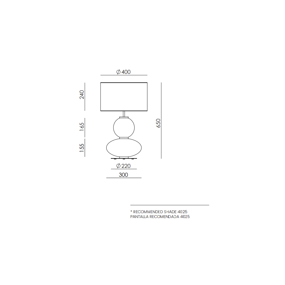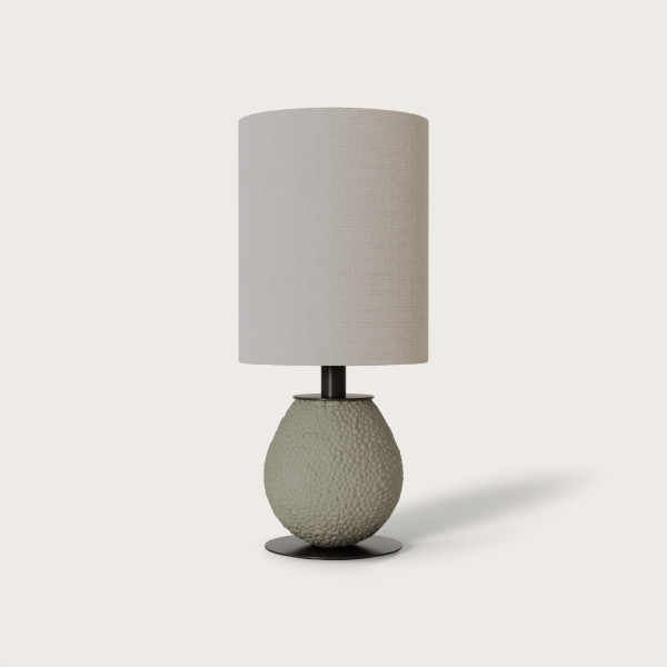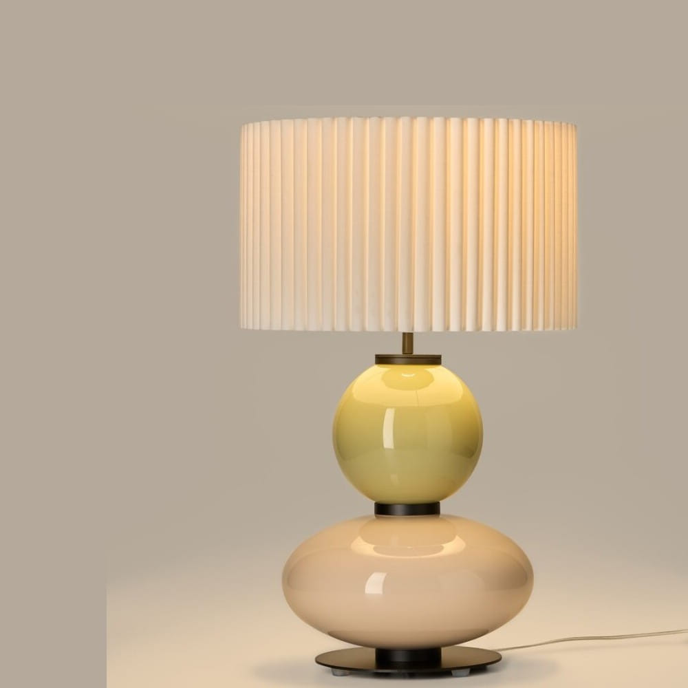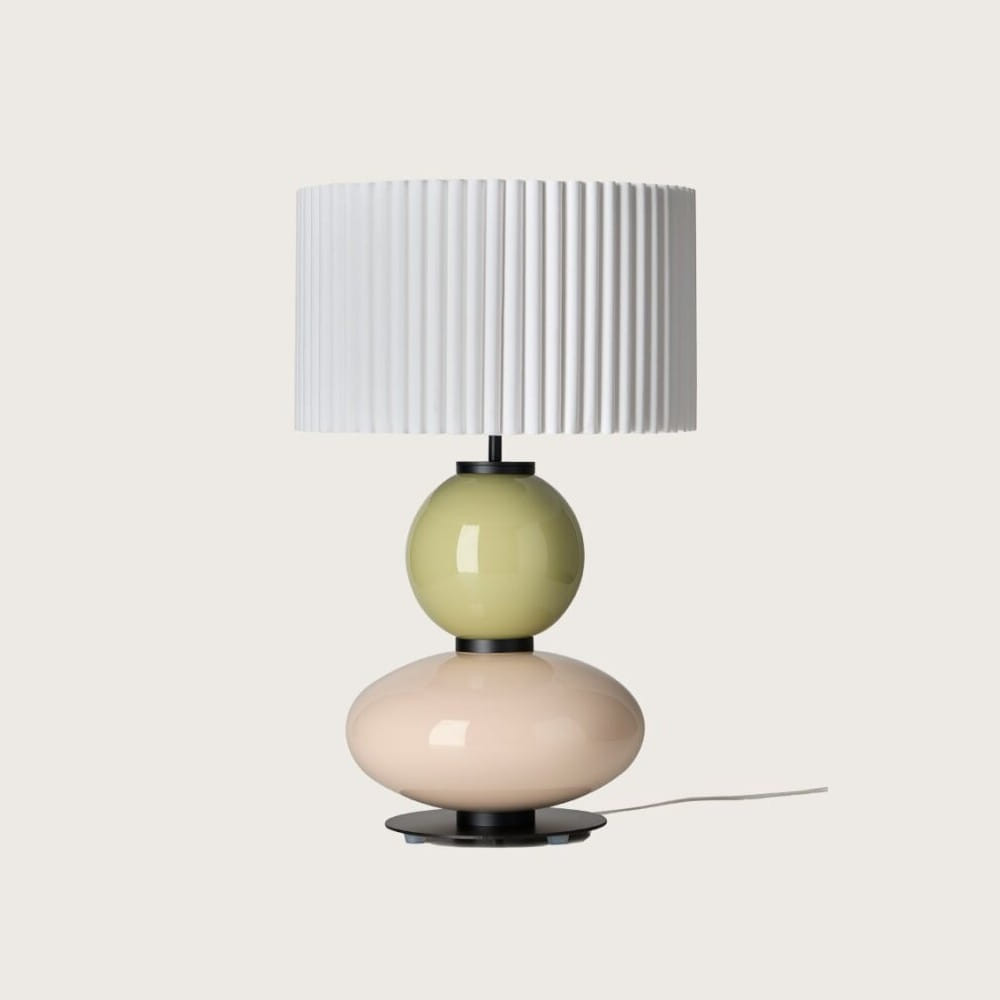 Lámpara de sobremesa Mapi, diseñada por AC Studio, que destaca por su equilibrio entre formas suaves y detalles contemporáneos. Su estructura está compuesta por un elegante cuerpo de vidrio formado por dos volúmenes orgánicos: una base inferior de forma ovalada y una esfera superior, creando una silueta escultórica y sofisticada.