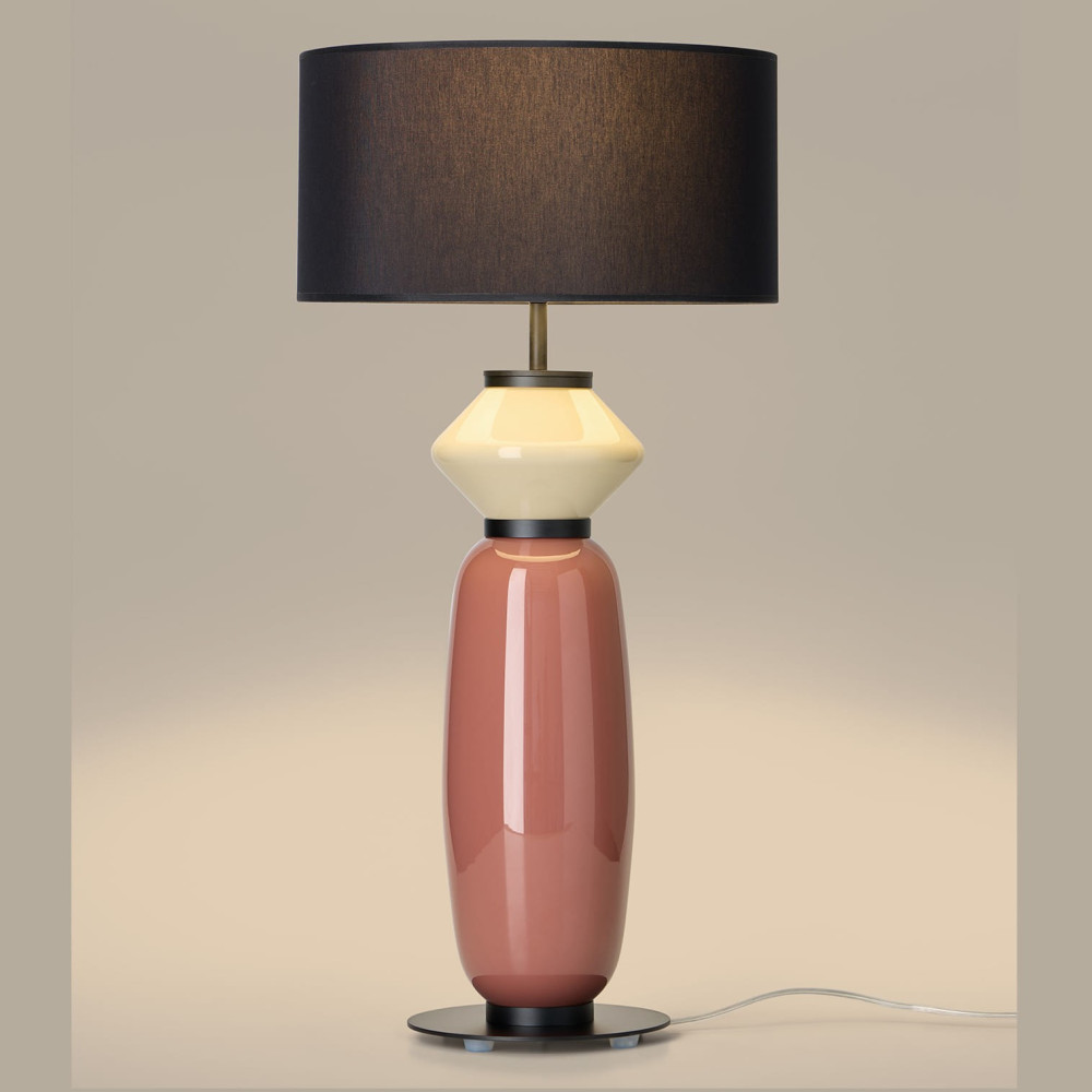 Lámpara de sobremesa Papi, diseñada por AC Studio, que destaca por su equilibrio entre formas suaves y detalles contemporáneos. Su estructura está compuesta por un elegante cuerpo de vidrio formado por dos volúmenes orgánicos: una base inferior de forma cilindrica y una base superior en forma de diamante, creando una silueta escultórica y sofisticada.