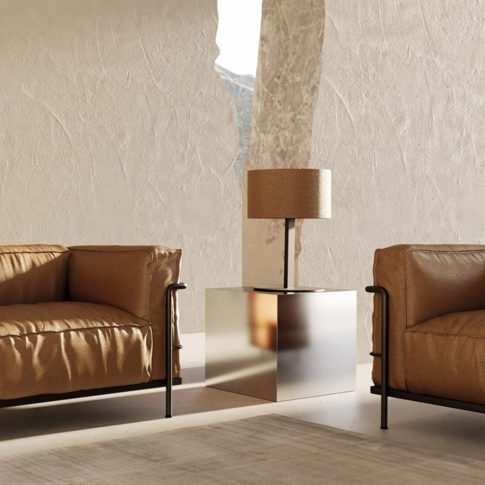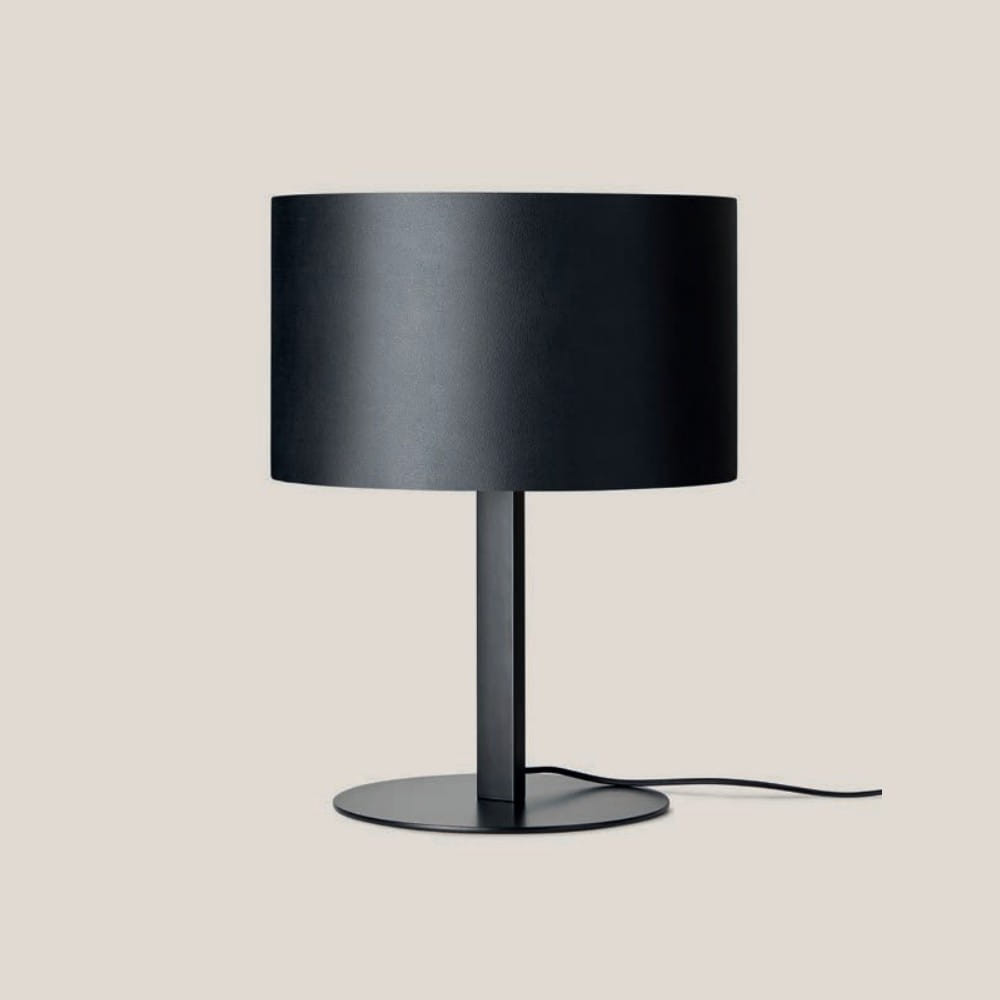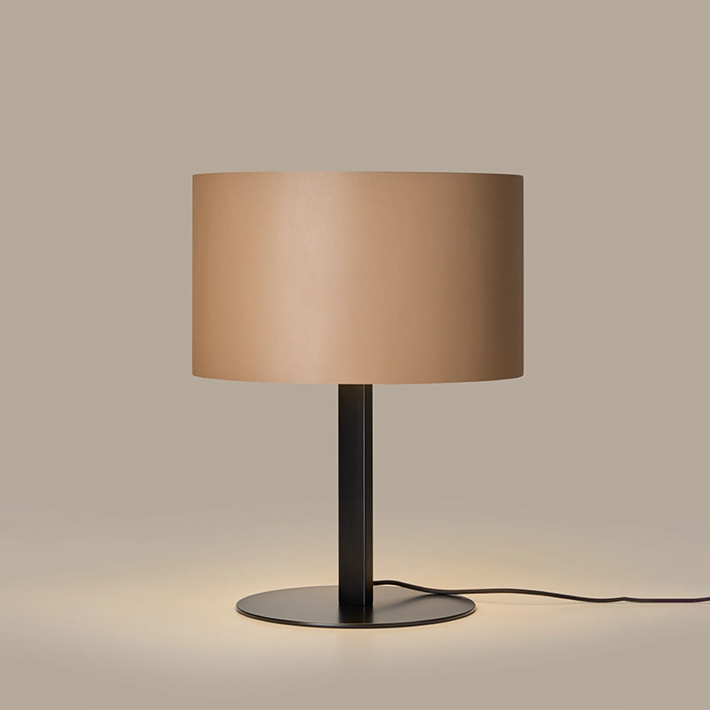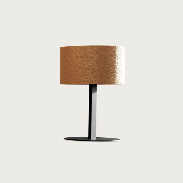 Lámpara de sobremesa de diseño contemporáneo, con una elegante base de metal negro mate que aporta solidez y carácter. Su pantalla de cuero, disponible en negro, naranja, marrón claro o marrón oscuro, añade calidez y un toque sofisticado, convirtiéndola en una pieza decorativa versátil para distintos estilos de interior.
