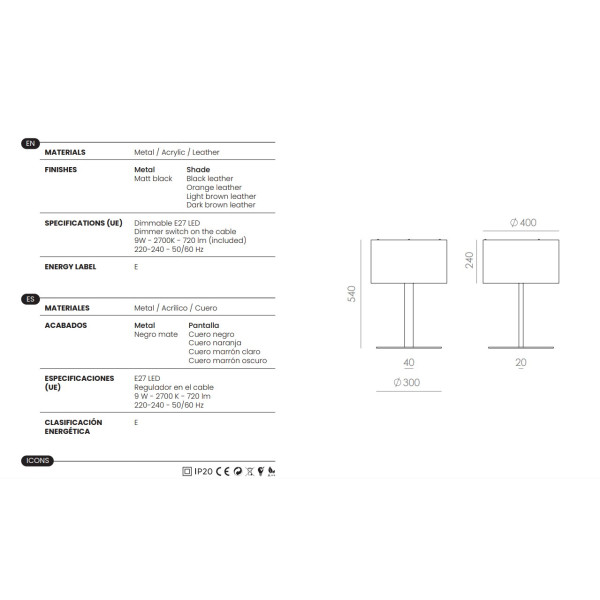 - 1 x E27 9w 720lm 2700K (Incluida)
