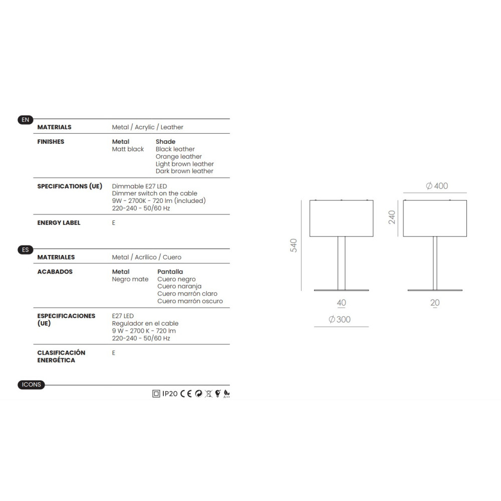 Lámpara sobremesa regulable con base de metal negro mate y pantalla de cuero a elegir entre varios acabados. 1xE27 incl.