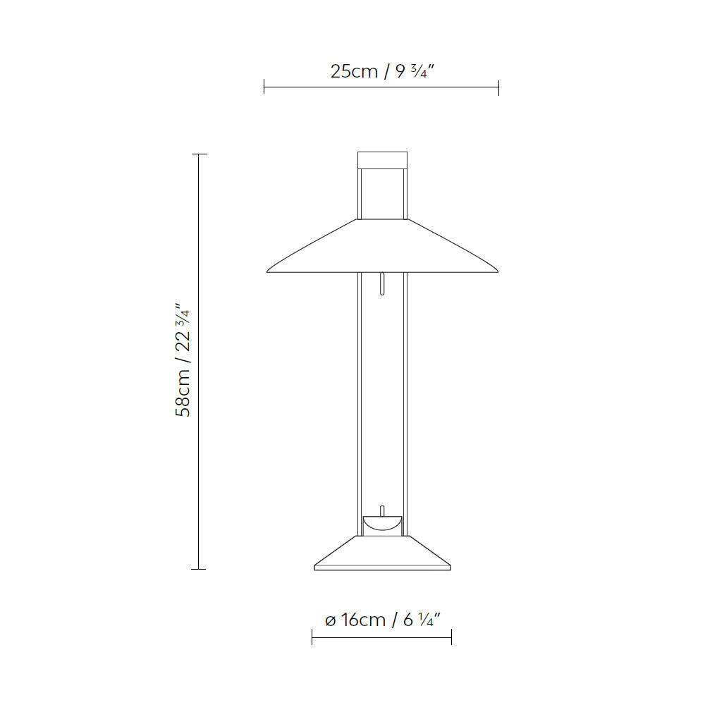 Luminaria de mesa de luz indirecta, fabricada en aluminio inyectado. Disponible en acabado raw, y también en aluminio brillo combinable con pantallas de aluminio brillo o de vidrio blanco.