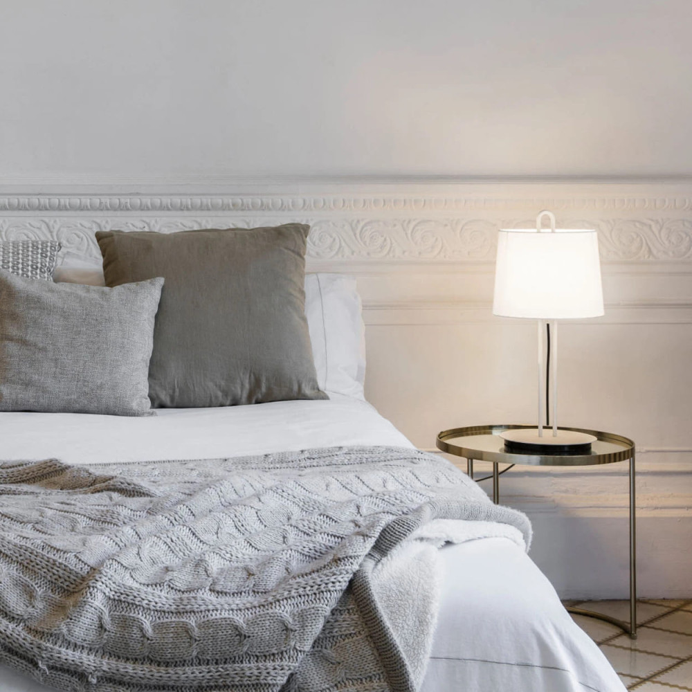 Lámpara de sobremesa blanca con pantalla textil blanca. MONTREAL es una colección de luminarias de diseño de Nahtrang. Gracias al pequeño gancho en la parte superior de sus estructuras, renueva una serie clásica tanto para hogares como para hoteles y negocios. Esta lámpara es ideal para iluminar una entrada o como iluminación puntual en un rincón.