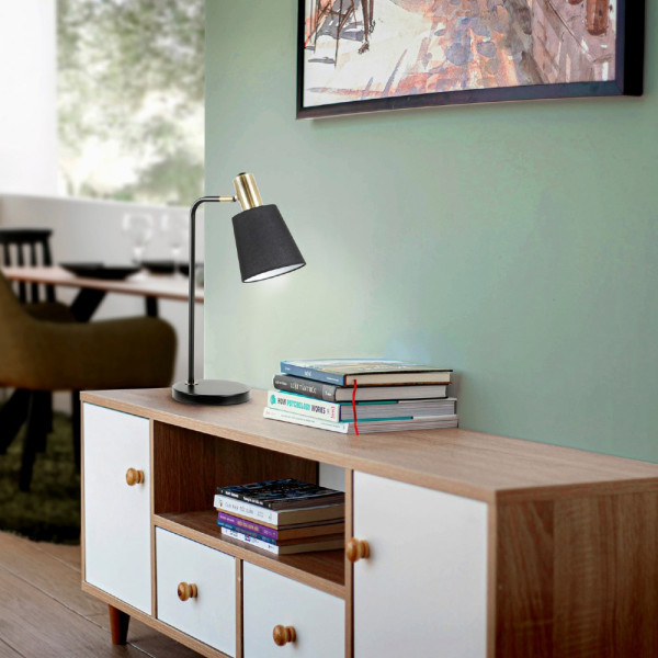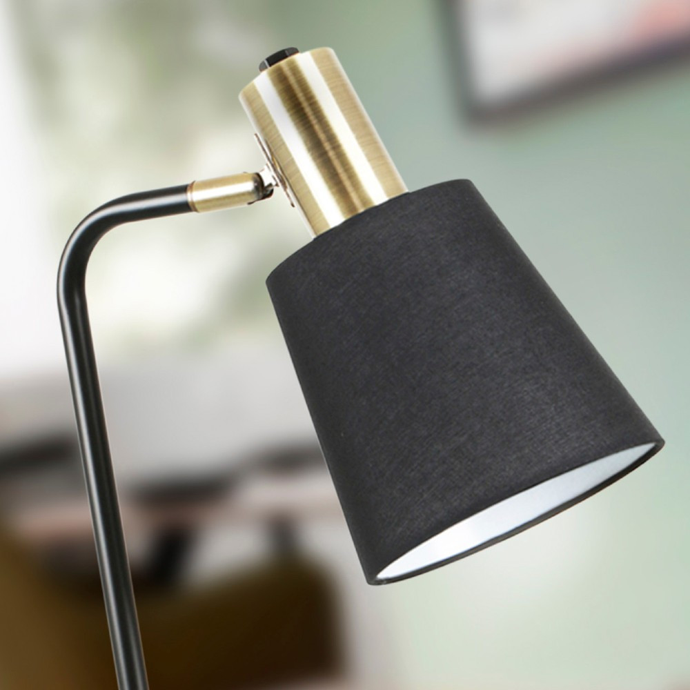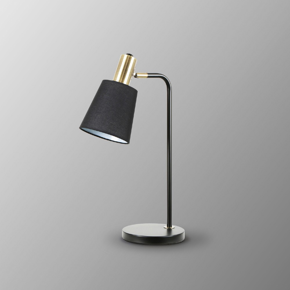Lámpara de sobremesa realizada en metal acabado negro mate y detalles en latón satinado. Pantalla textil negra con inclinación regulable. 1 E27