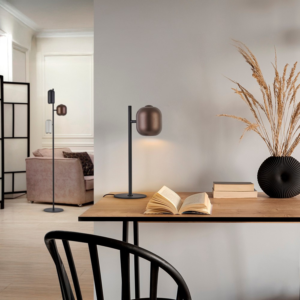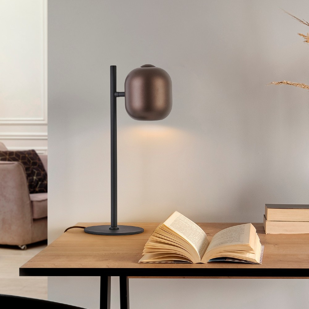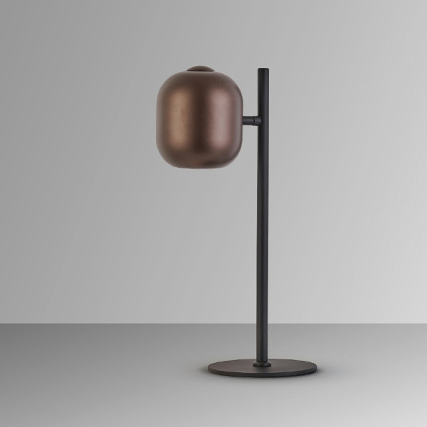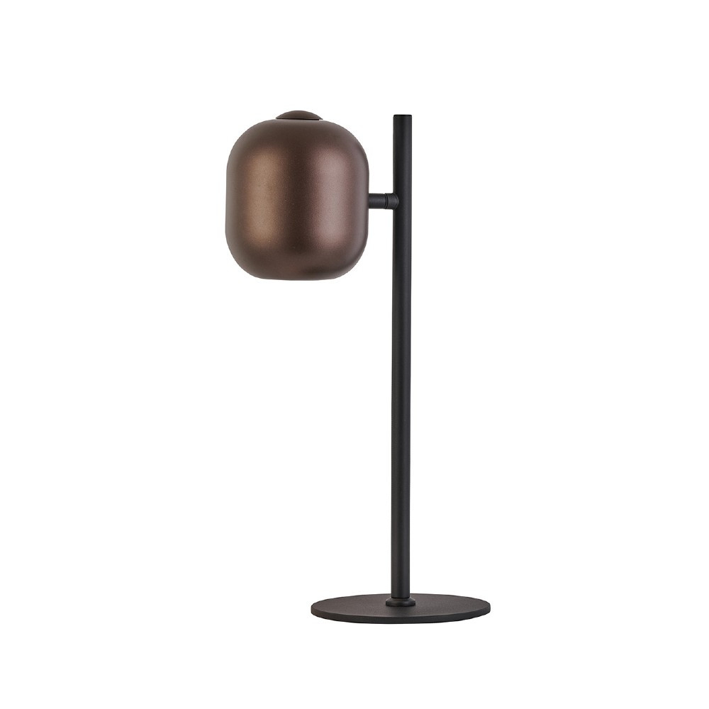 Lámpara de sobremesa realizada en metal acabado negro mate. Tulipa de metal marrón oscuro. Portalámparas GU10.