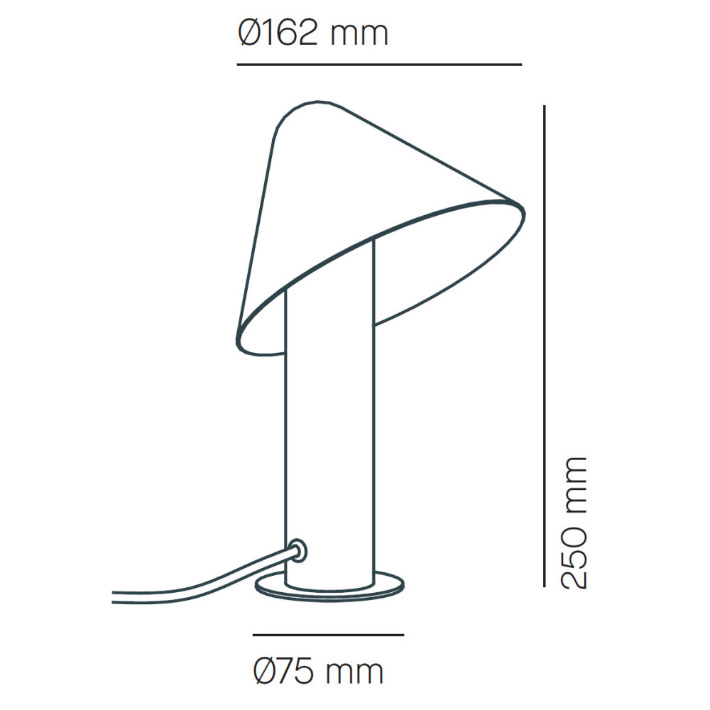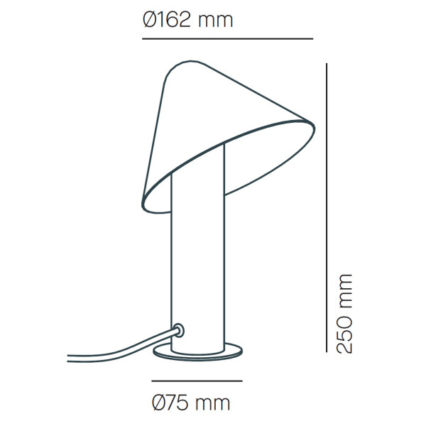 Pantalla difusora en aluminio repulsado, con imán interior para la orientación de la luz. Tubo y base, en acero. Interruptor aéreo incluido en el cable de dos metros de longitud.