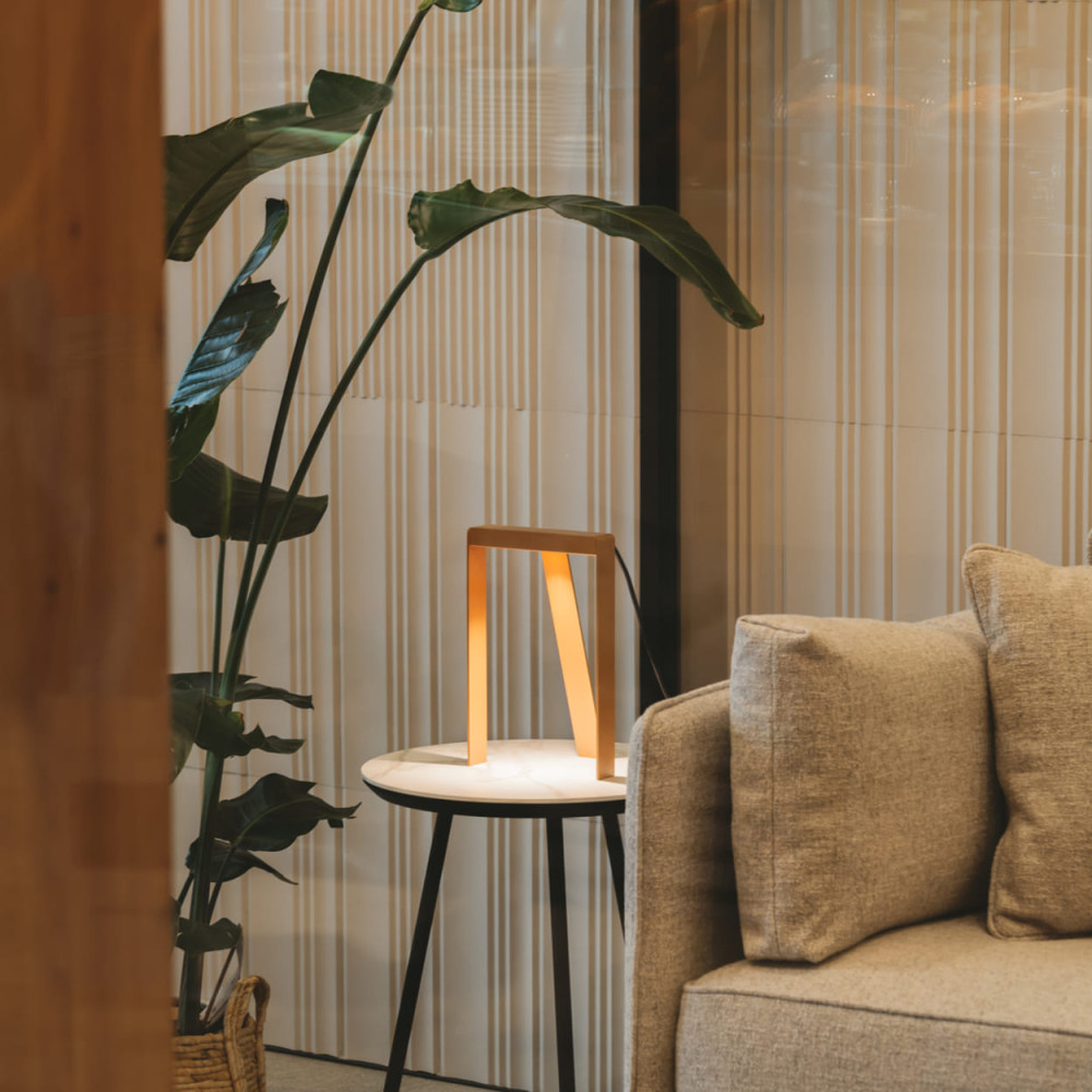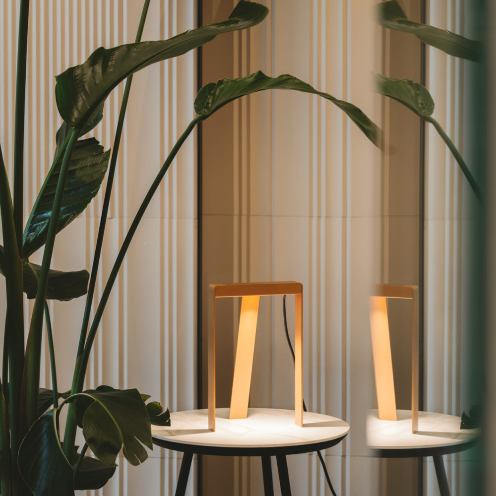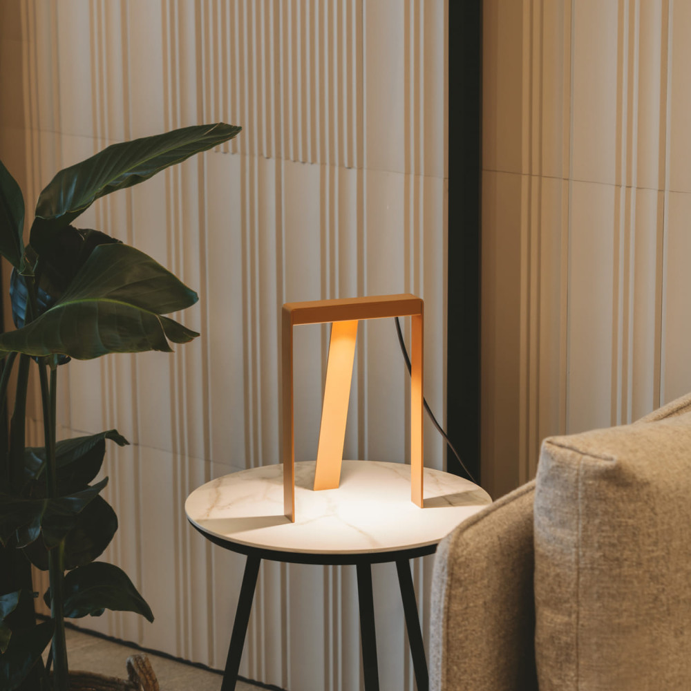 Sobremesa acabado en dorado metalizado texturado (D2525 Gundar metallic satin). LED COB 4,5W, 2700K, 360 lm.