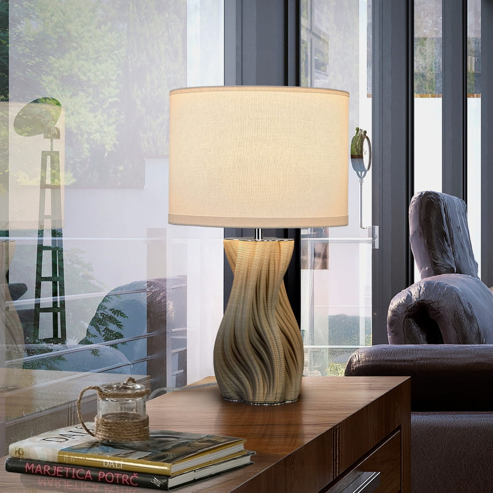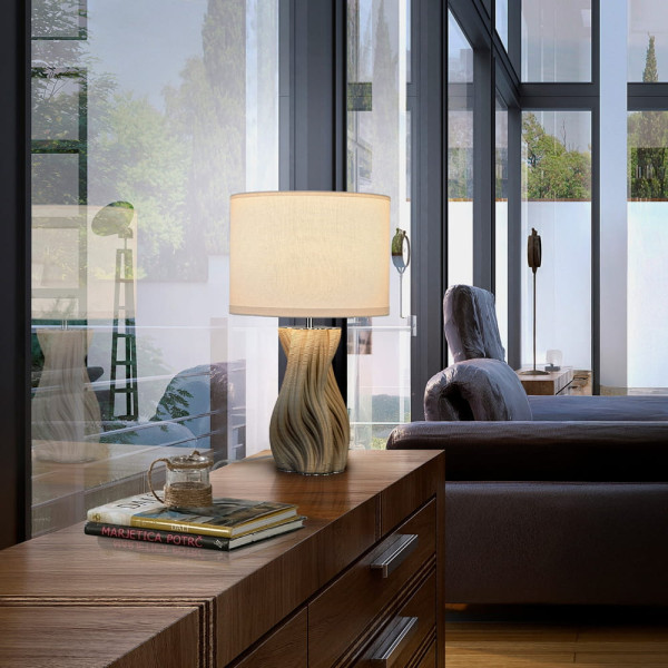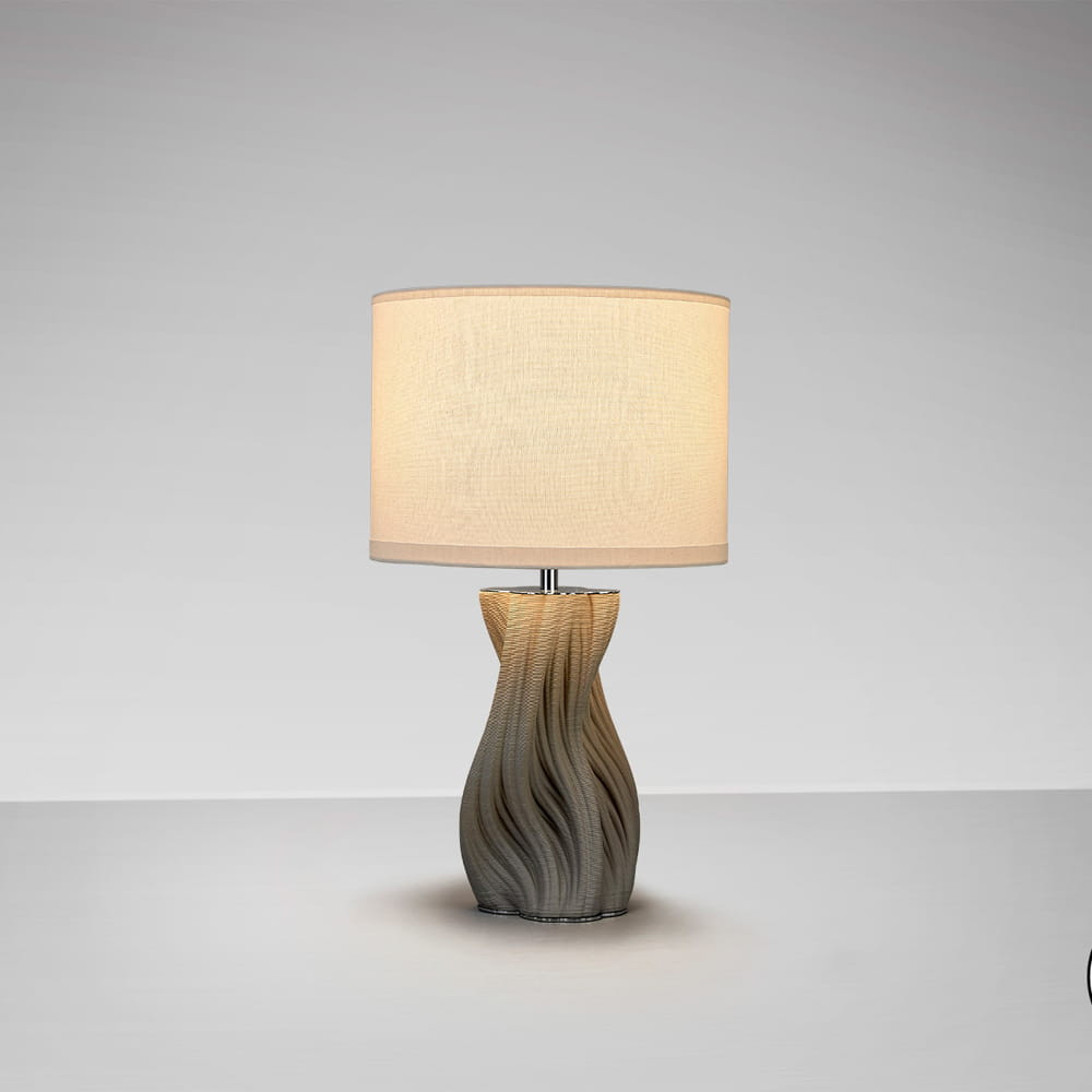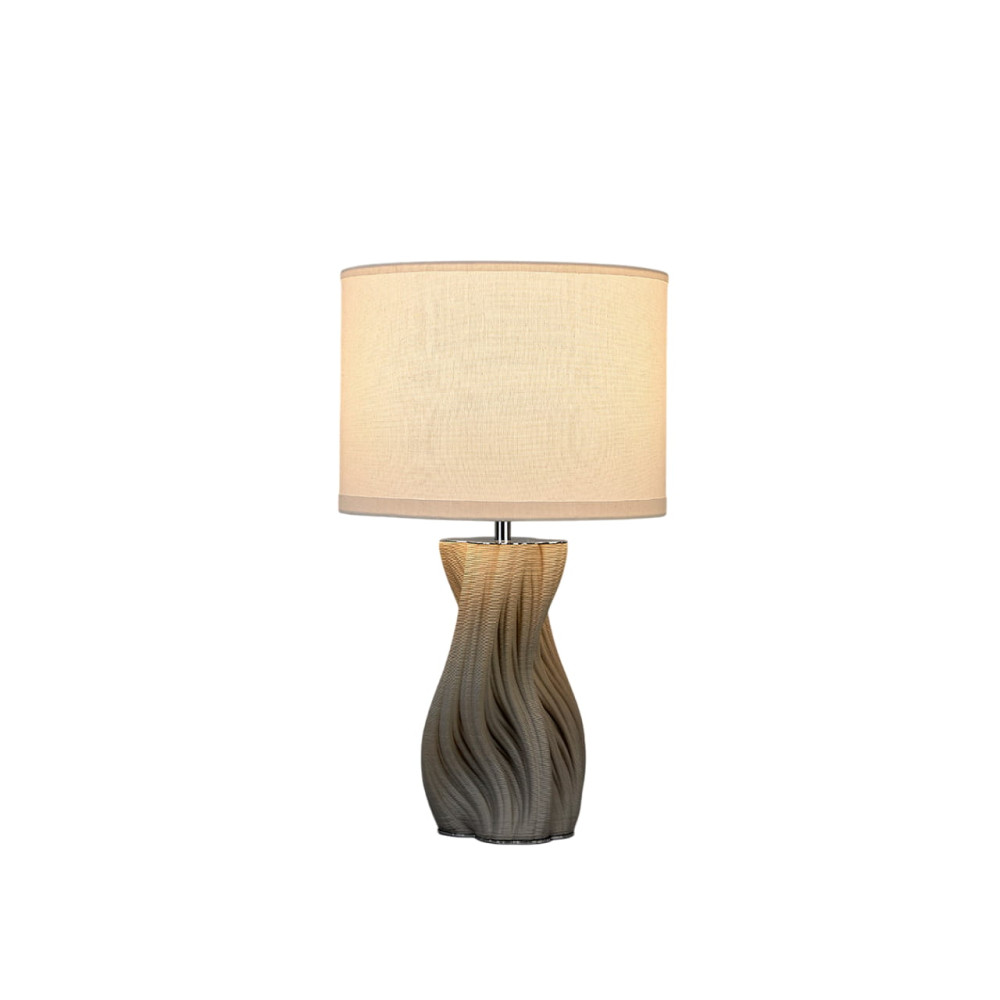 Sobremesa de cerámica impresa en 3D acabado blanco, metal acabado cromo. Pantalla textil blanca y bombilla incluidas