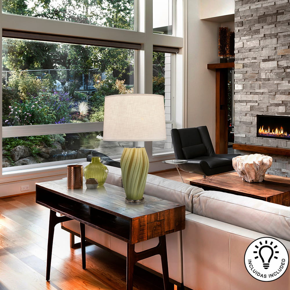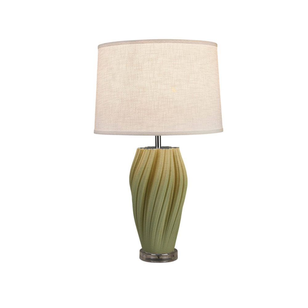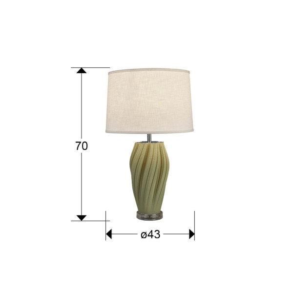 Sobremesa de cerámica impresa en 3D acabado verde claro, metal acabado cromo. Pantalla textil blanca y bombilla incluidas