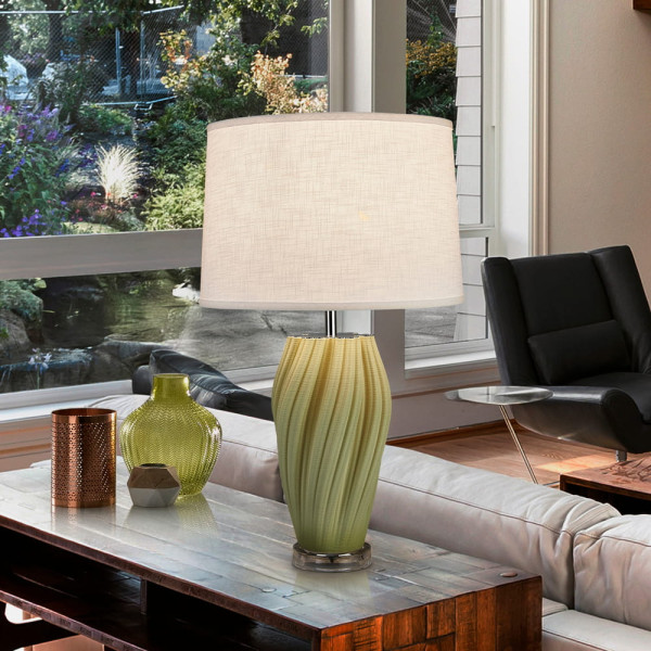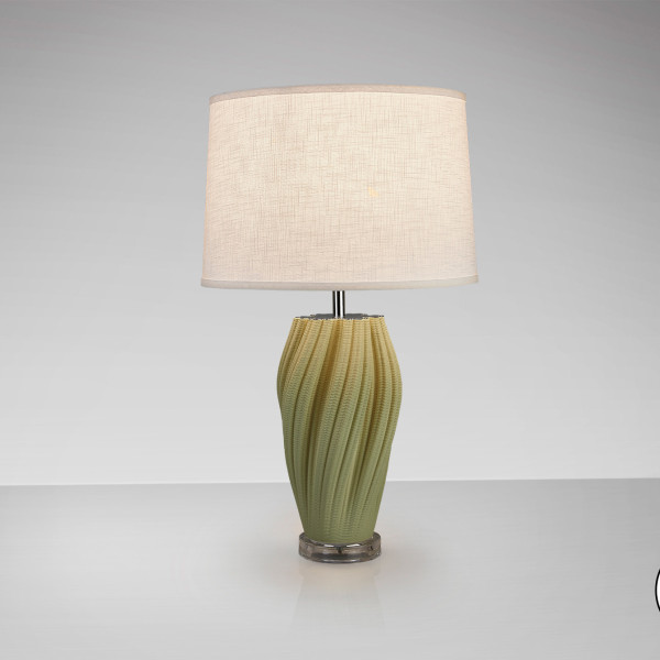 Lámpara de sobremesa de 1 luz. Realizada en cerámica impresa en 3D acabado verde claro, metal acabado cromo. Pantalla textil blanca.