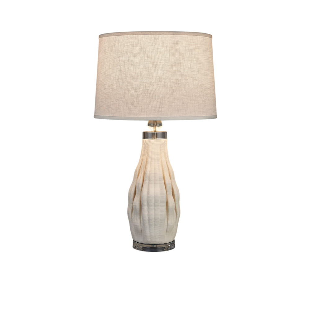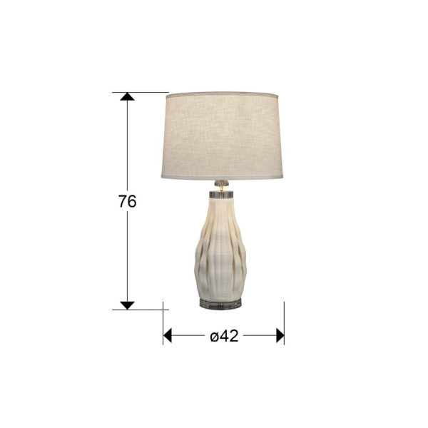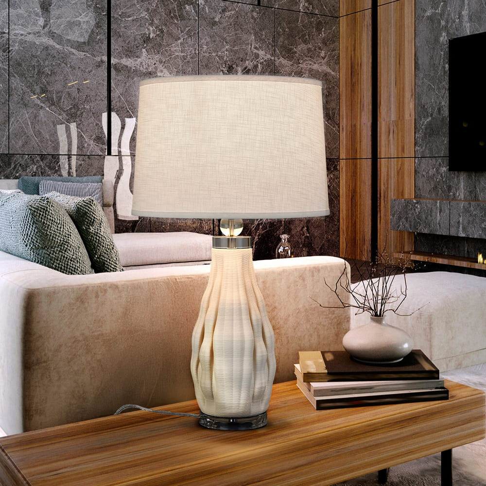 Sobremesa de cerámica impresa en 3D acabado blanco, metal acabado cromo. Pantalla textil blanca y bombilla incluidas