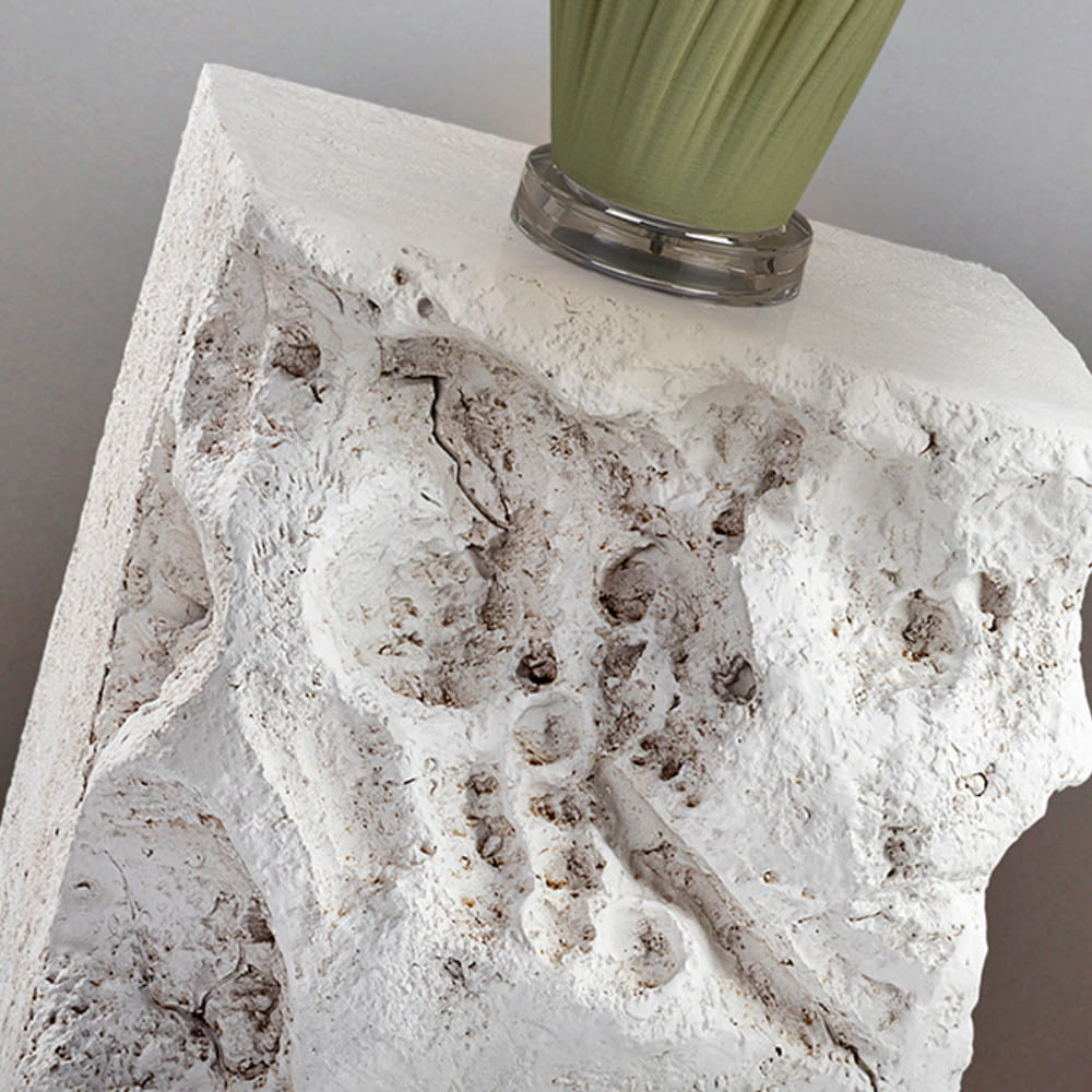 Sobremesa de cerámica impresa en 3D acabado verde claro, metal acabado cromo. Pantalla textil blanca y bombilla incluidas