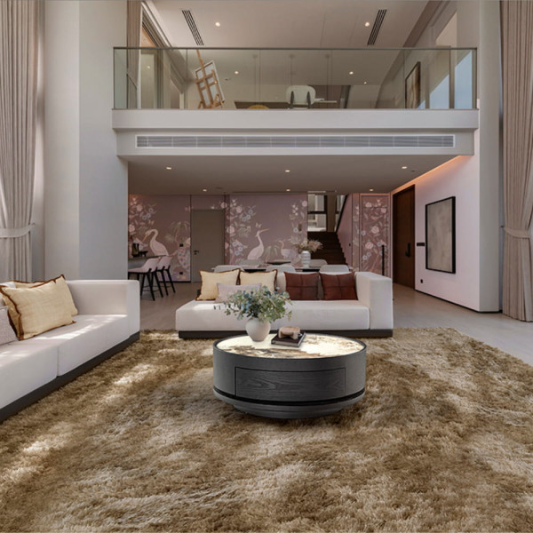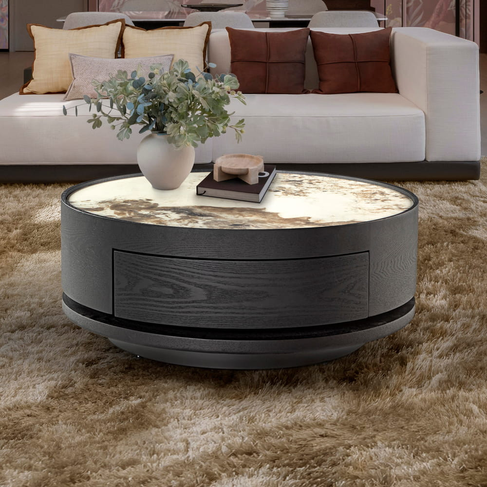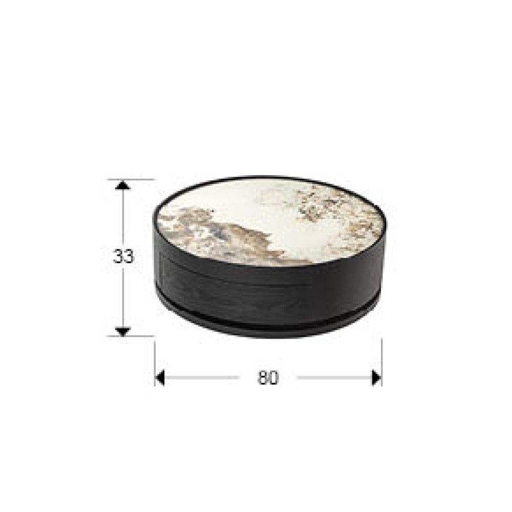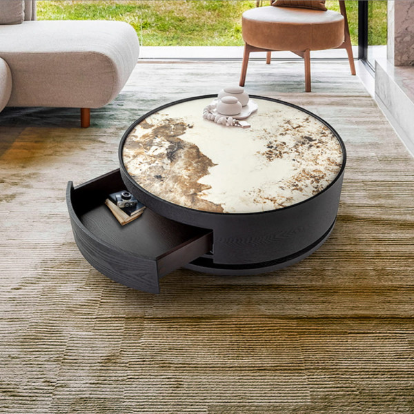 Mesita de noche redonda, cajón con guías. Madera contrachapada acabado caqui claro y tapa de cristal smoke.