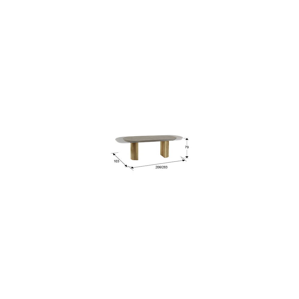 Mesa de comedor extensible, estructura realizada en MDF, patas con superficie acanalada, acabado madera. Tapa de MDF con superficie melamínica de alta resistencia, acabado piedra mate, con cantos a juego. Extensible hasta 283 cm.