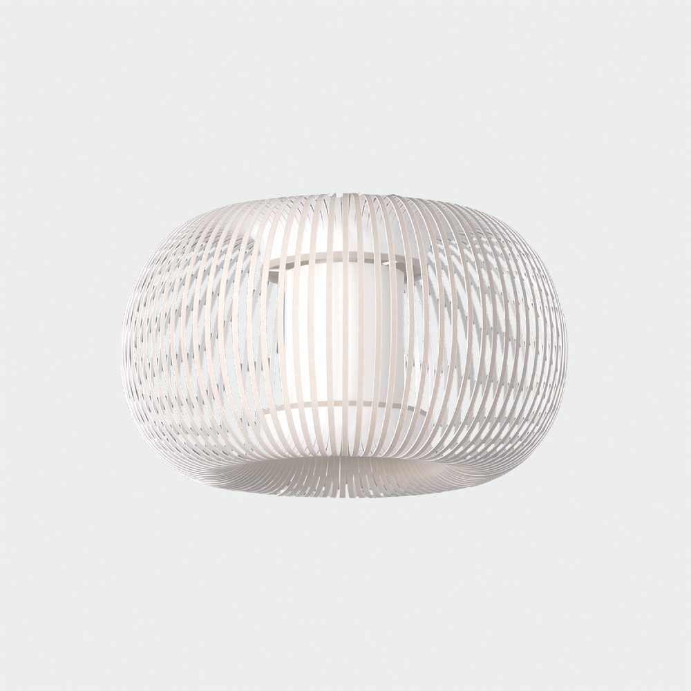 MIRTA es una pantalla para estructuras colgantes con casquillo E27. Fabricada en textil y acrílico con acabado en blanco.