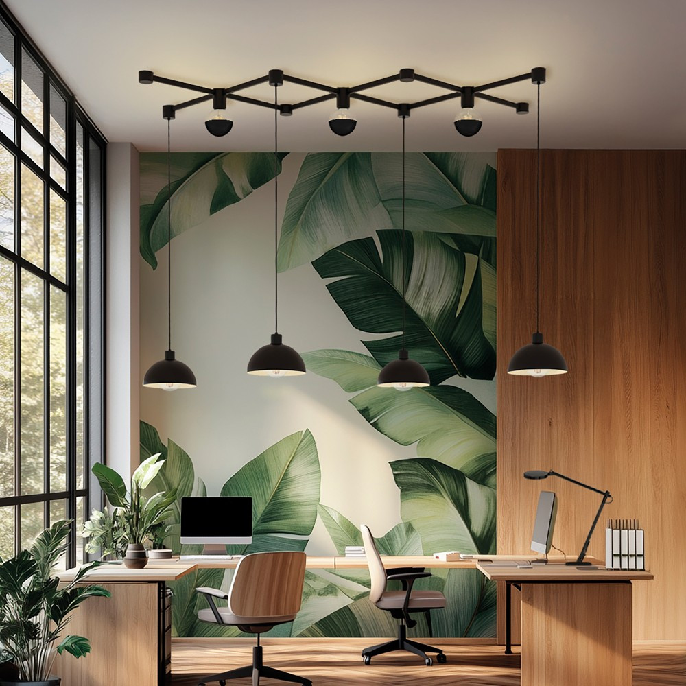Pantalla fabricada en metal y acabado negro texturado. Admite instalación en casquillos E27.