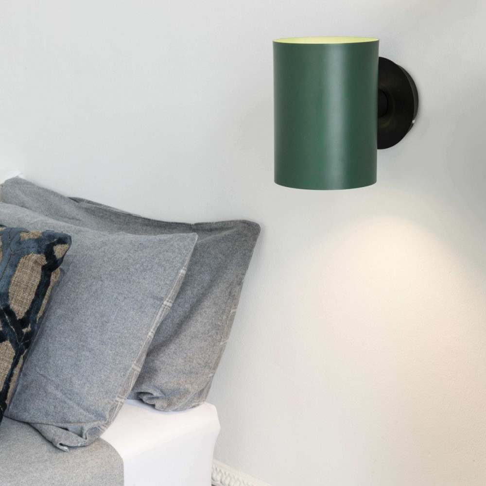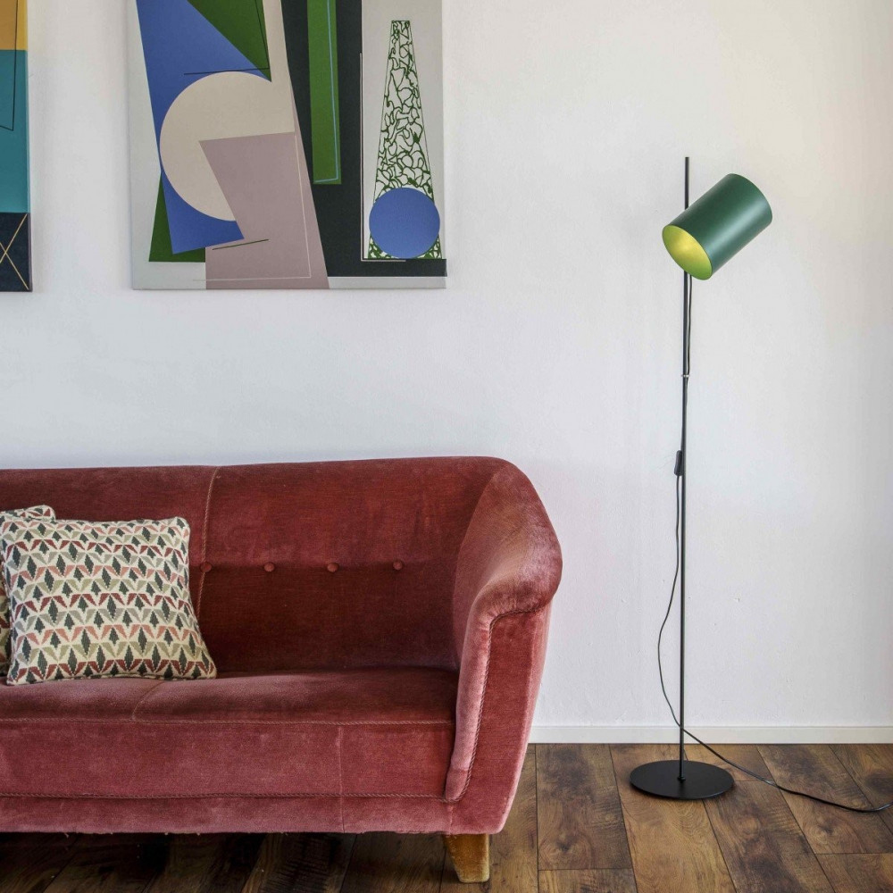 Pantalla de forma cilíndrica en acabado verde diseñada por Faro Lab para las estructuras LUPE. Un diseño singular para dar un toque moderno a cualquier espacio. Permite dirigir la luz más fijamente.