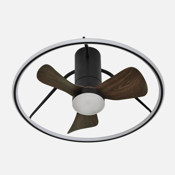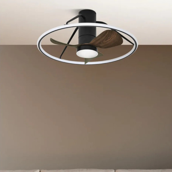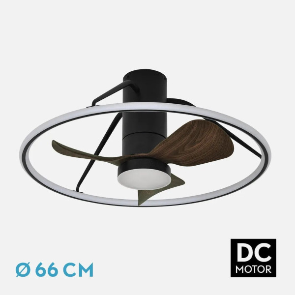 Ventilador DC de la serie OPORTO MINI realizado en ABS, silicona y metal, en color NEGRO con tres aspas en color MARRON. Tiene seis velocidades ajustables con motor DC. Tecnología LED incorporada con una potencia de 46W, 4600 lúmenes y 3 TEMPERATURAS SELECCIONABLES DE LUZ( 3000-4000-6000K) luz cálida, natural y blanco frío. Ventilador de diseño muy moderno y futurista, su cuerpo principal se encuentra rodeado por un aro de luz combinando muy bien con estilos de decoración tanto con estilos modernos como étnicos y naturales. Tiene unas dimensiones de 31,5x66x66 centímetros. Control de aire verano o invierno. Mando a distancia INCLUIDO con REGULADOR DE INTENSIDAD DE LA LUZ en tres posiciones y TEMPORIZADOR que permite programar para que el ventilador se apague automáticamente desde 1 hora hasta las 4 horas, lo que conlleva un gran ahorro de energía. Puede utilizar el control VIA APP : FAN LAMP PRO, desde el que podrá manejar también su ventilador de manera fácil e intuitiva desde su móvil. Modelo disponible en negro/marrón y en blanco/haya y en dos tamaños diferentes.