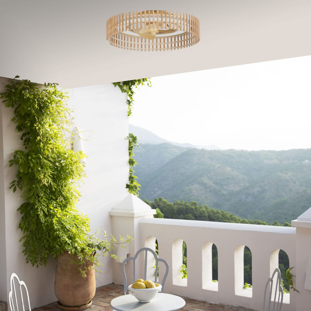 El ventilador de techo con luz LED Bambu tiene un motor DC ultrasilencioso y de bajo consumo. Su pantalla de madera le aporta una estética natural, de estilo boho-chic. Encaja en dormitorios y salones de un tamaño de hasta 9m2. Cuenta con una protección IP44, por lo que es apto también para uso exterior en terrazas y porches.