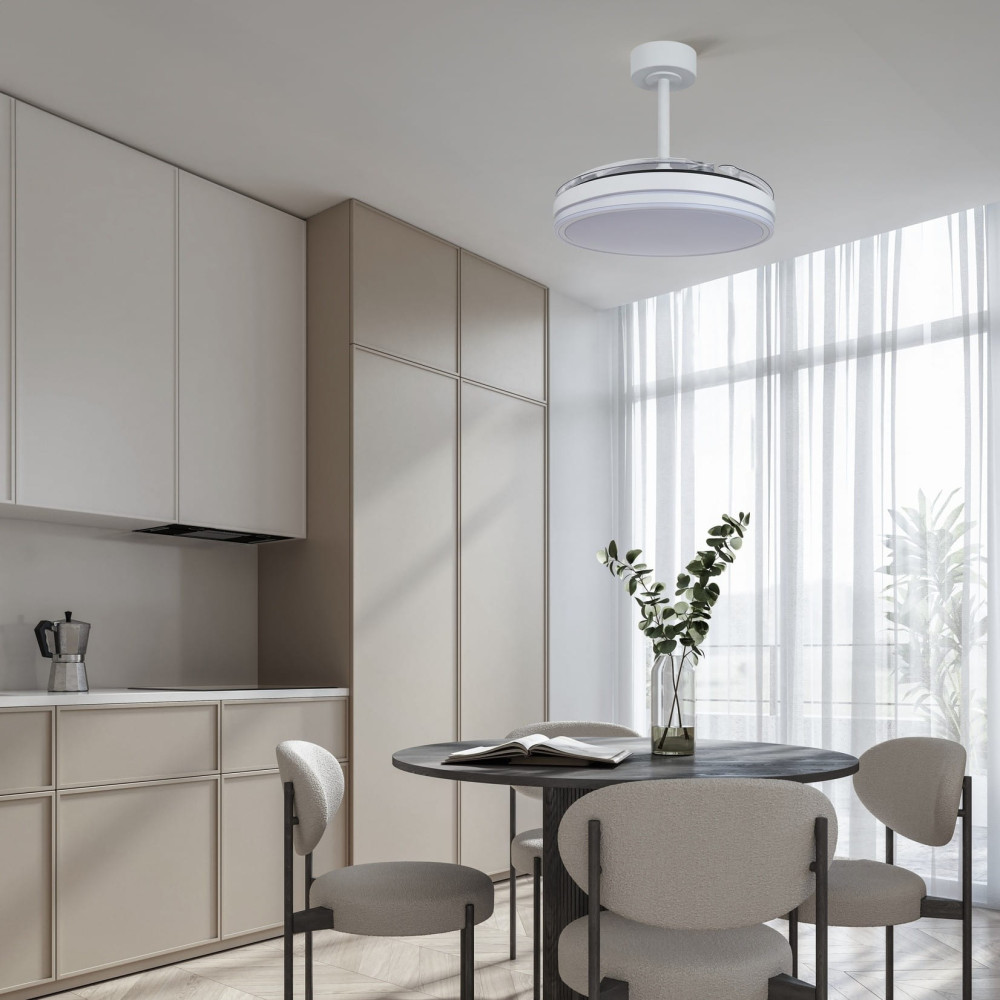 Está diseñado con aspas retráctiles que se pliegan y se despliegan con elegancia, ofreciendo un diseño dinámico y versátil que se adapta a cualquier ambiente. Disponible en dos tamaños, este plafón se integra perfectamente con una amplia gama de estilos de decoración.