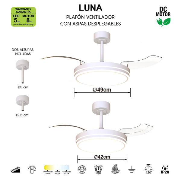 Equipado con una potente luz LED, Luna ofrece una iluminación brillante y ajustable en intensidad y temperatura de color, permitiéndote crear el ambiente perfecto para cualquier ocasión. Ya sea que desees una luz cálida y acogedora para una noche tranquila en casa o una luz brillante y fresca para iluminar una reunión social, este plafón ventilador te proporciona el control total sobre tu entorno.