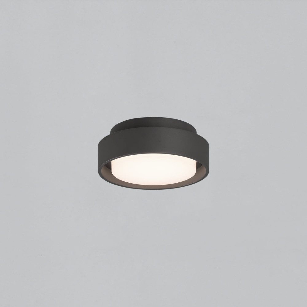 KUMA es un plafón para exterior fabricado en aluminio con difusor de policarbonato. Acabado en antracita y disponible en dos tamaños.