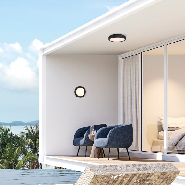 KUMA es un plafón para exterior fabricado en aluminio con difusor de policarbonato. Acabado en blanco y disponible en dos tamaños.